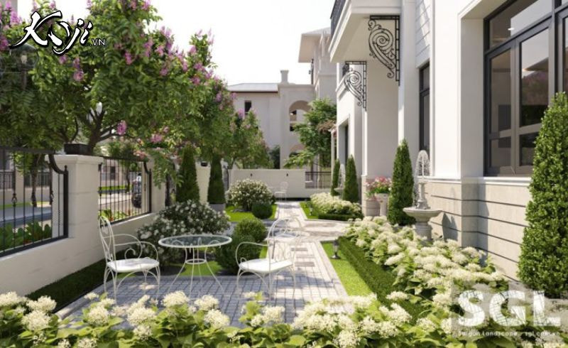 Là một trong những mẫu sân vườn đẹp dành cho các căn biệt thự phong cách cổ điển. Thi công, tạo cảnh sân vườn đẹp này không đòi hỏi quá nhiều diện tích nhưng cần phải có sự tỉ mỉ và đối xứng. Mặt bằng sân vườn sẽ được trang trí chủ yếu bằng những bức tượng nghệ thuật, các hàng rào nhỏ xinh mang đặc trưng của phương Tây.