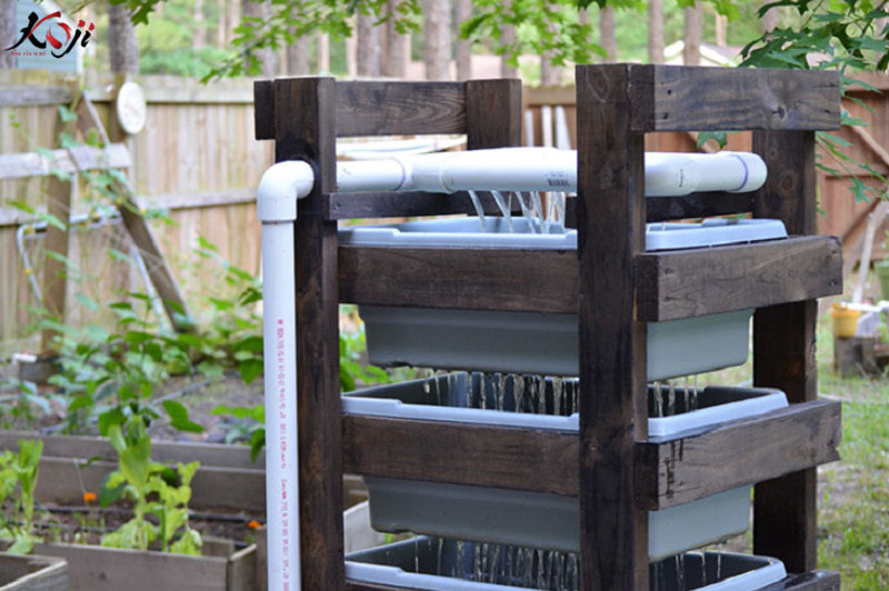 Dưới đáy của két nhựa ở tầng 1 nên khoan nhiều lỗ để cho nước thoát ra, và đảm bảo được lưu lượng nước khi về hồ cá không bị tràn. Bạn cũng có thể khoan nhiều các lỗ tròn to, để tạo giàn mưa, tạo vạch ngang thùng cho nước chảy thành thác để có nguồn oxy mạnh.