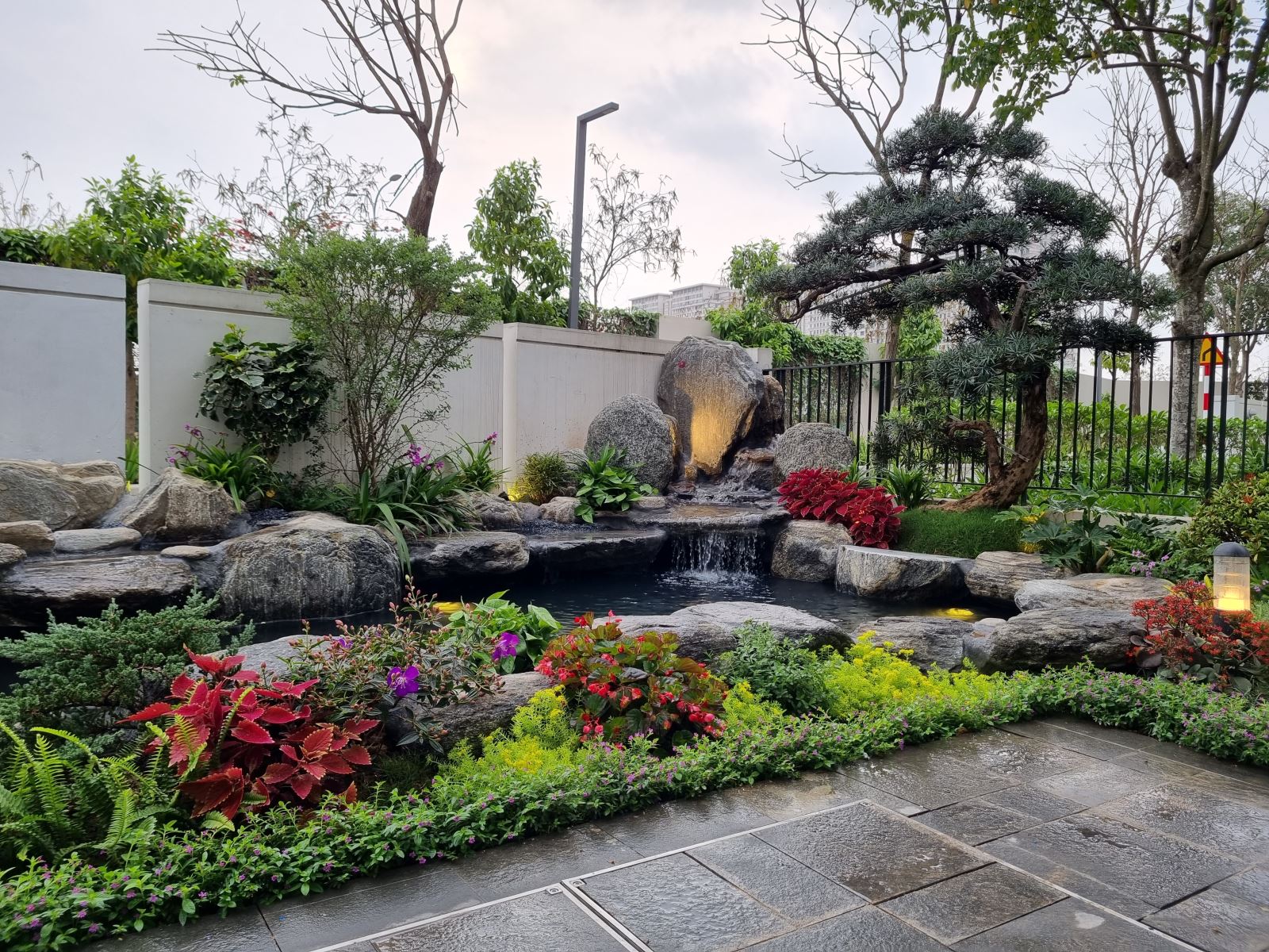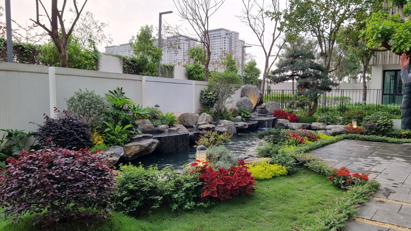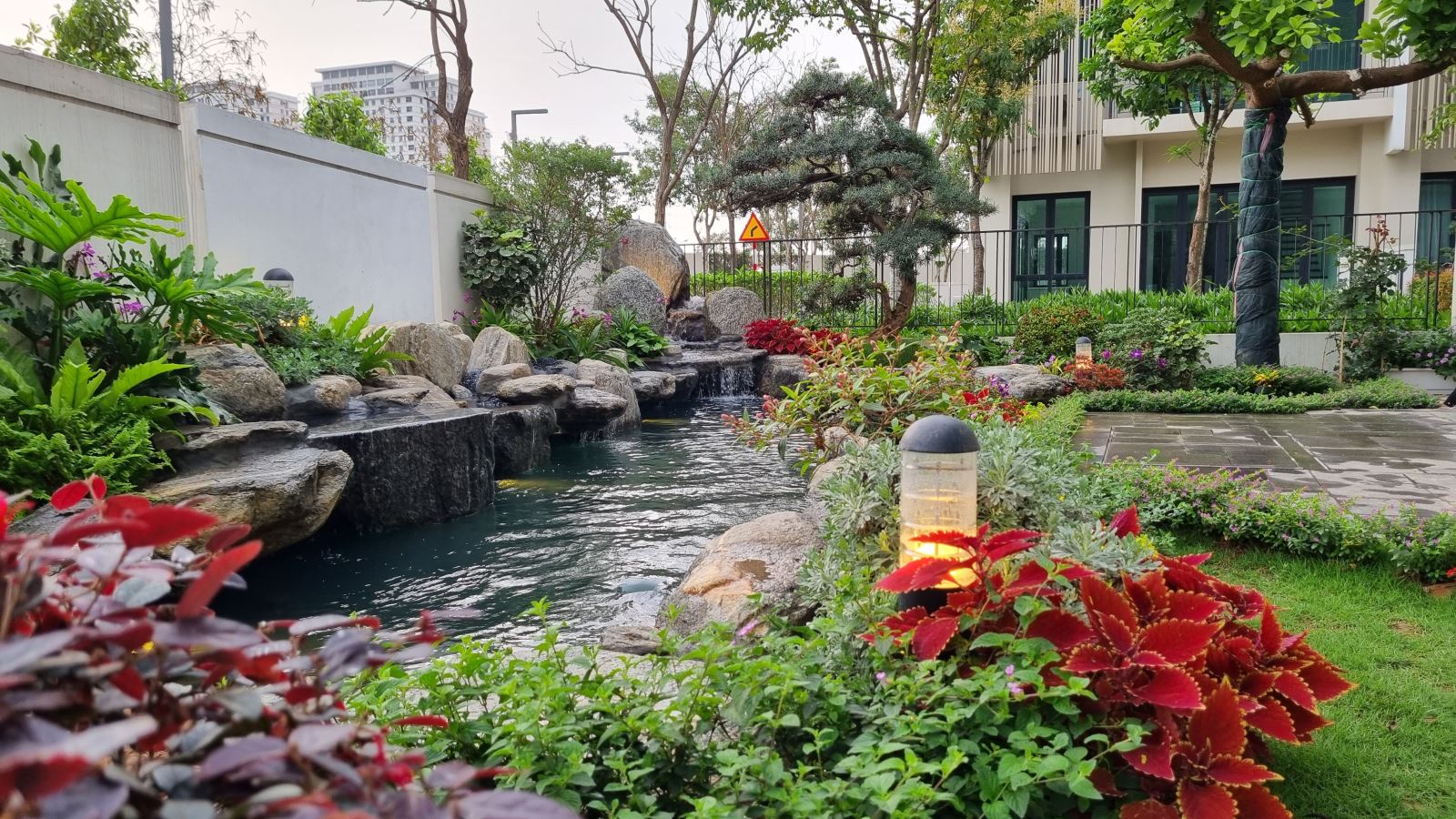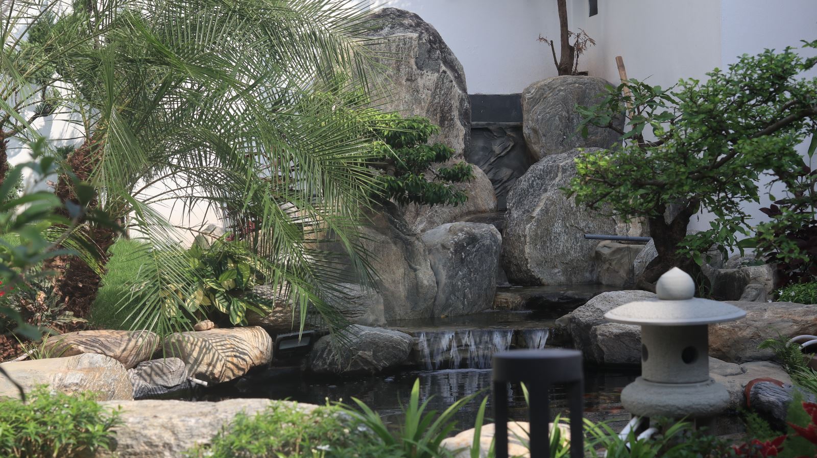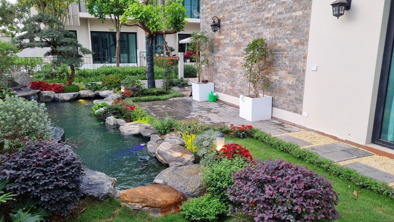 Bên cạnh cây xanh, sân vườn nhà ống còn có thể kết hợp với các yếu tố khác như hồ nước nhỏ, thác nước hay tiểu cảnh khác. Những yếu tố này không chỉ làm tăng tính thẩm mỹ mà còn giúp điều hòa không khí, tạo cảm giác thư thái và trong lành hơn.