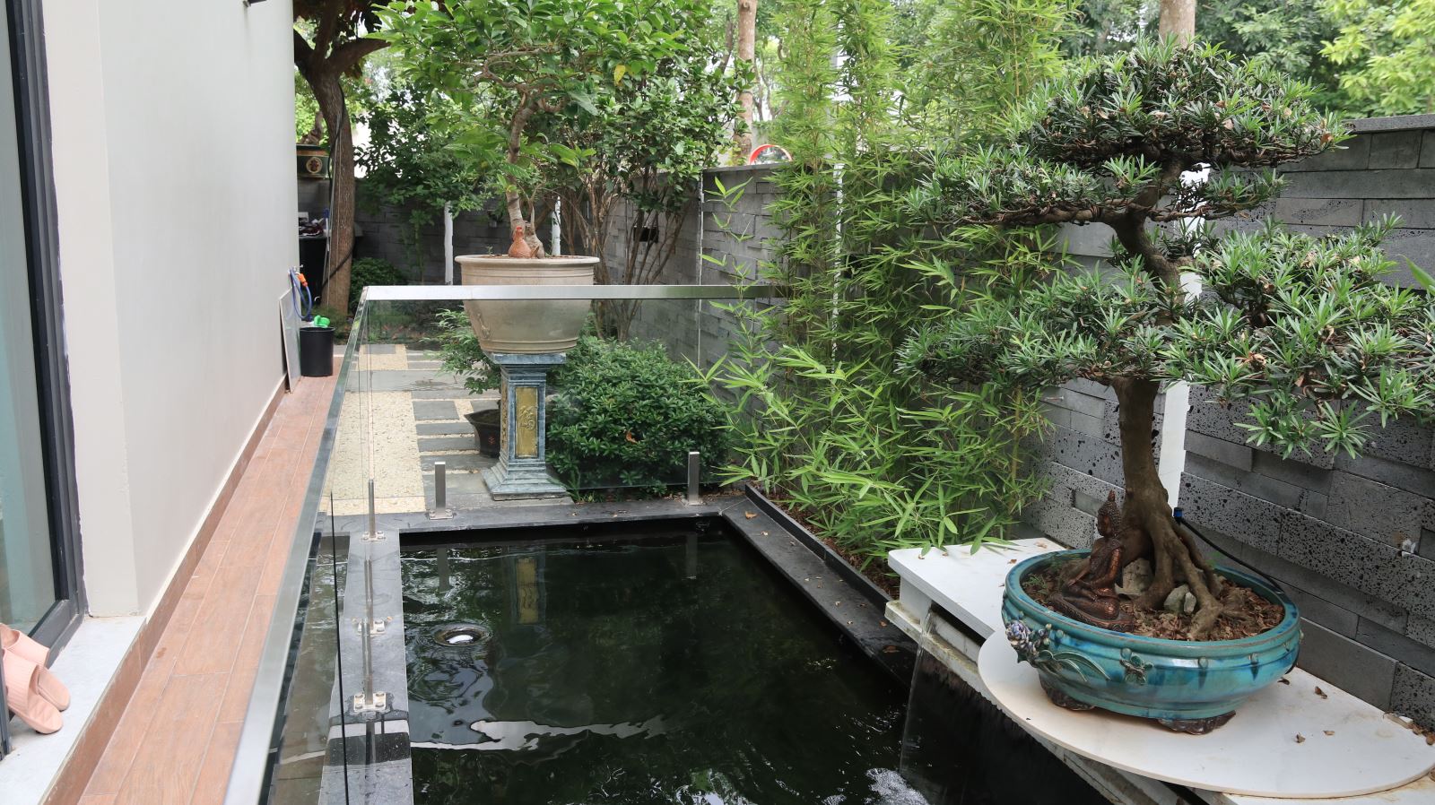 Bạn có thể đặt một số chậu hoa, cây cảnh, thác nước mini hay hòn non bộ trong sân vườn. Tiếng nước chảy róc rách không chỉ tạo cảm giác thư thái mà còn có thể ngăn chặn một số luồng khí xấu. Bố trí cây xanh và hồ nước hợp lý cũng sẽ giúp cải thiện chất lượng cuộc sống của các thành viên trong gia đình.