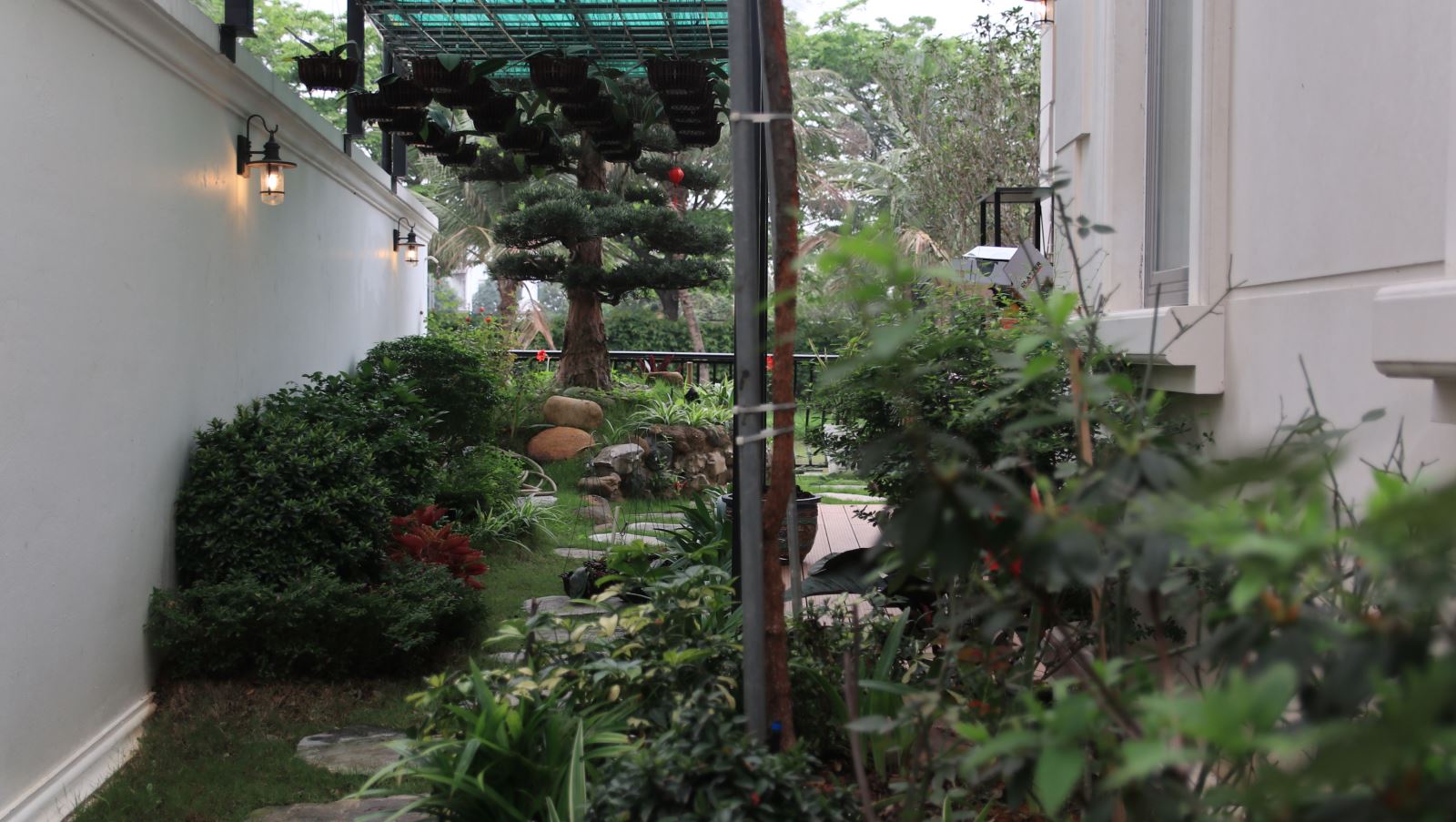 Đối với thiết kế sân vườn nhà ống này, gia chủ nên ưu tiên trồng các loại cây nhỏ, trồng cây leo hoặc chậu treo trên tường. Trường hợp trồng cây hai bên hông nhà cần phải có sự tương đồng. Không nên làm một bên đẹp hơn hoặc bên có đồi đất cao, bên đất trũng thấp.