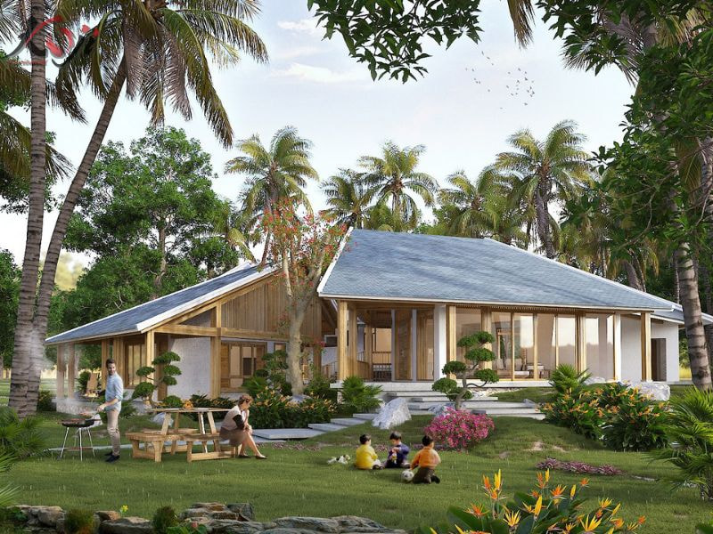 Ở không gian này, những mẫu nhà vườn được thiết kế đầy khoa học và nghệ thuật, đảm bảo không gian sinh hoạt thoải mái. Nhà đẹp sân vườn resort có thiết kế tối giản với vật liệu gỗ cùng khung bằng thép có thể chịu lực cao.