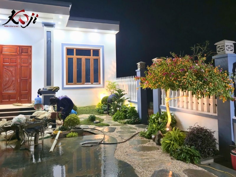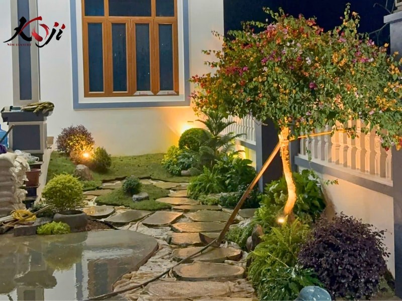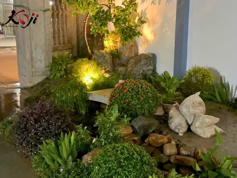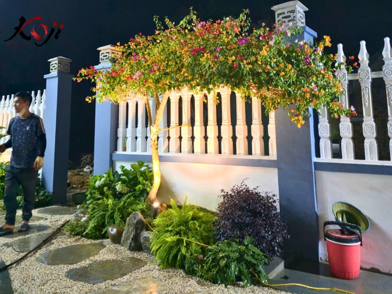 Khi mặt trời dần buông xuống và những ánh đèn bắt đầu được bật lên, khu sân vườn Zen Nhật mà đội ngũ Koji đang thi công lại hiện lên theo một cách rất khác: trầm hơn, sâu hơn và giàu cảm xúc hơn. Không còn là bối cảnh sáng rực ban ngày, sân vườn dưới ánh đêm biến thành một không gian thiền tĩnh, nơi ánh sáng được dùng như một “ngôn ngữ” để kể câu chuyện riêng của cảnh quan.
