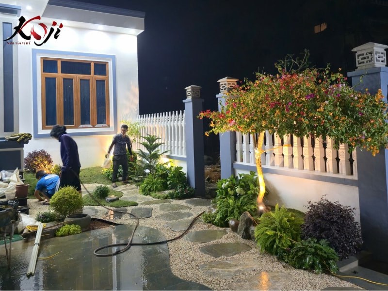 Trong giai đoạn đang thi công, đội ngũ chúng tôi luôn chỉnh từng góc đèn, từng hướng chiếu để đạt hiệu quả thị giác cao nhất. Sân vườn đẹp ban ngày là điều dễ làm, nhưng để đẹp và có cảm xúc vào ban đêm, đó là cả một nghệ thuật kết hợp giữa ánh sáng và bố cục.