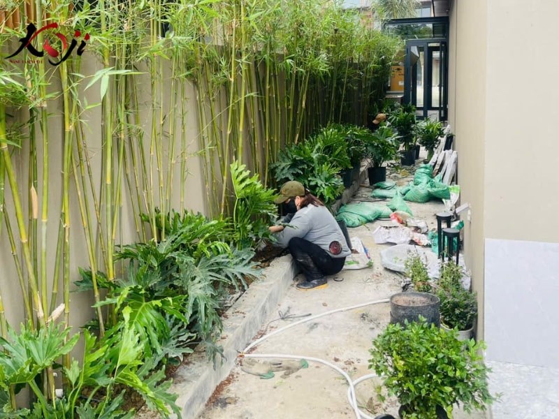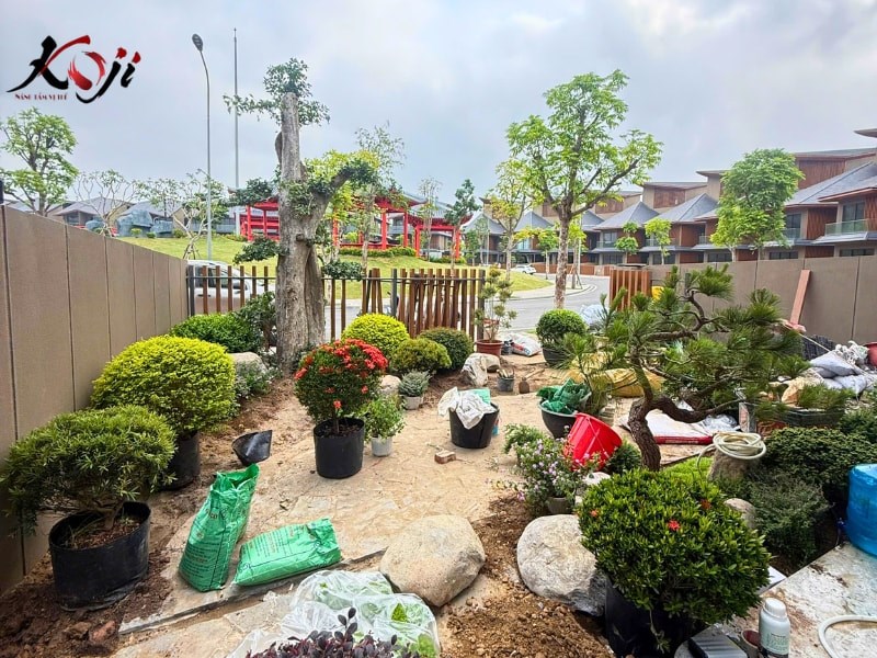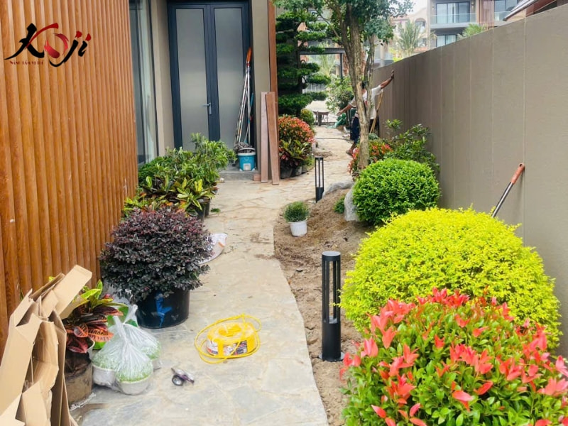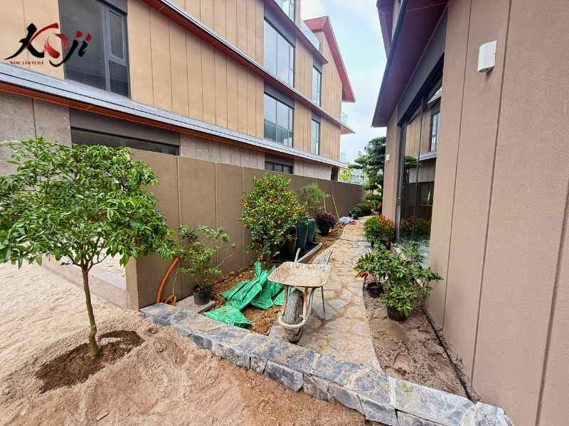Dự án thi công sân vườn biệt thự tại Hải Phòng mà Koji Landscape đang thực hiện là một công trình đang được triển khai với tiến độ bài bản và kiểm soát chặt chẽ từng hạng mục. Ngay từ những ngày đầu, đội ngũ kỹ thuật đã tiến hành xử lý mặt bằng, định hình lối đi và phân chia khu vực trồng cây theo đúng bản vẽ thiết kế.