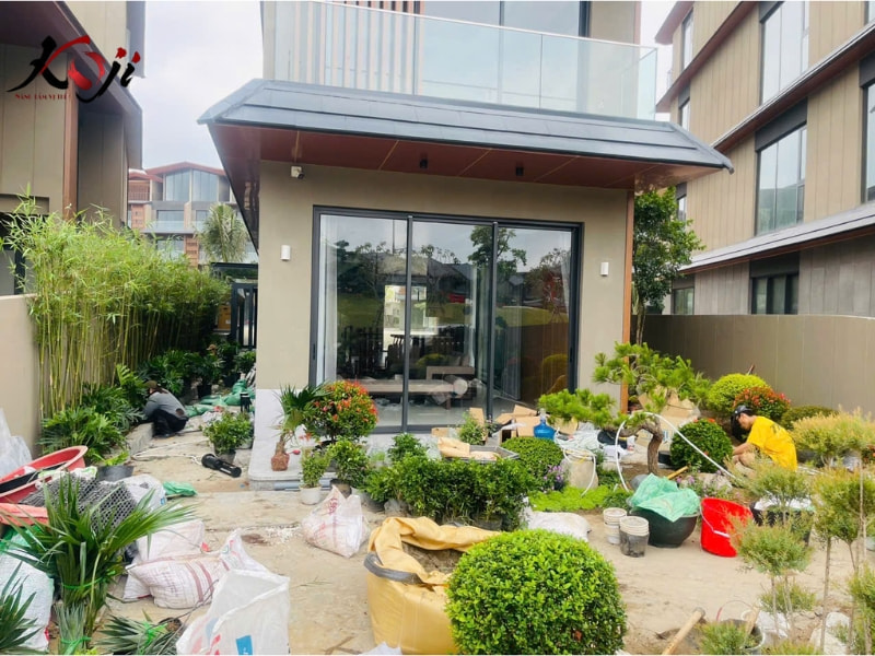 Một trong những hạng mục quan trọng đang được thi công là hệ thống tiểu cảnh và cây xanh. Các loại cây như tùng, cây bụi, cây hoa và tre trúc được lựa chọn kỹ lưỡng, phù hợp với phong cách sân vườn và điều kiện khí hậu Hải Phòng. Việc trồng cây được thực hiện theo từng lớp, đảm bảo độ phủ xanh và tính thẩm mỹ cho không gian.
