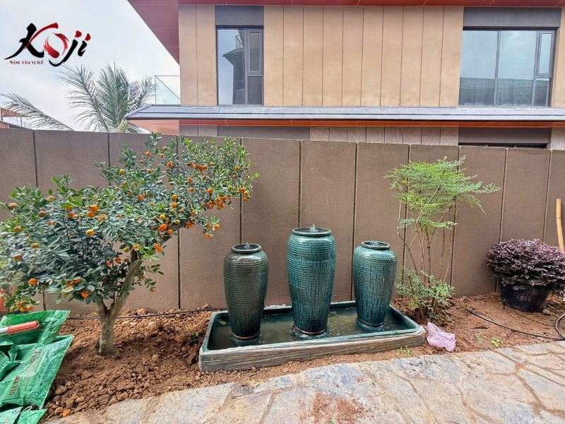 Bên cạnh đó, khu vực tiểu cảnh nước với các chum gốm trang trí cũng đang được hoàn thiện. Đây là điểm nhấn quan trọng giúp tăng yếu tố phong thủy, đồng thời mang lại cảm giác mát mẻ và sinh động cho khu vườn. Hệ thống cấp thoát nước được xử lý kỹ lưỡng ngay từ đầu nhằm đảm bảo vận hành ổn định lâu dài.