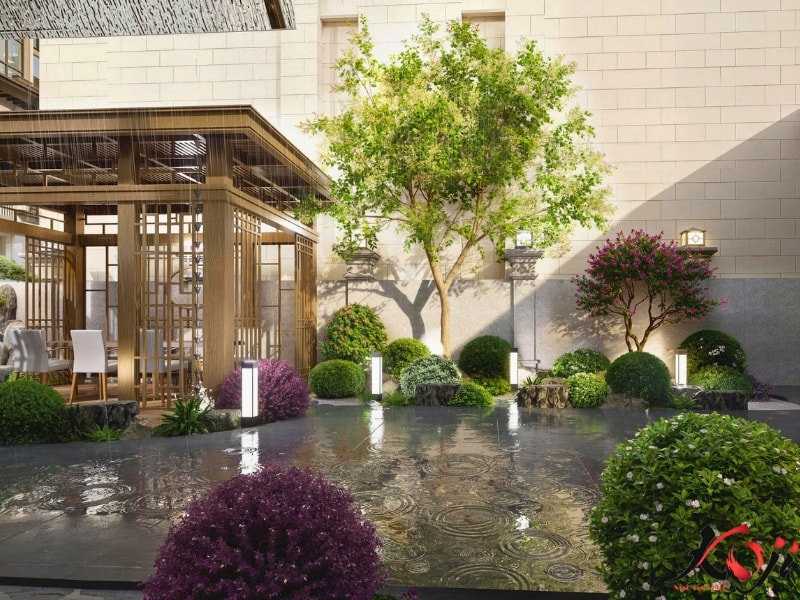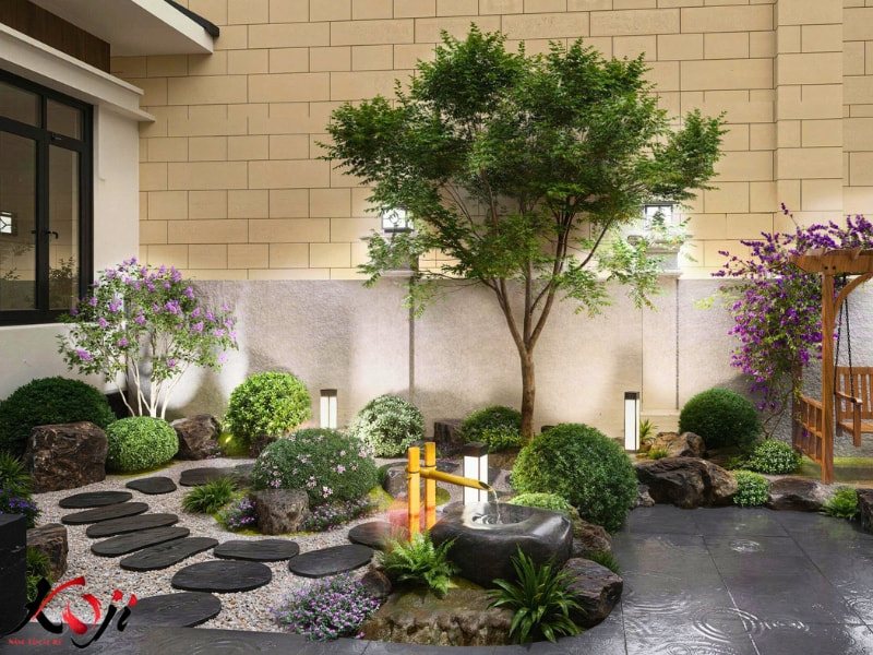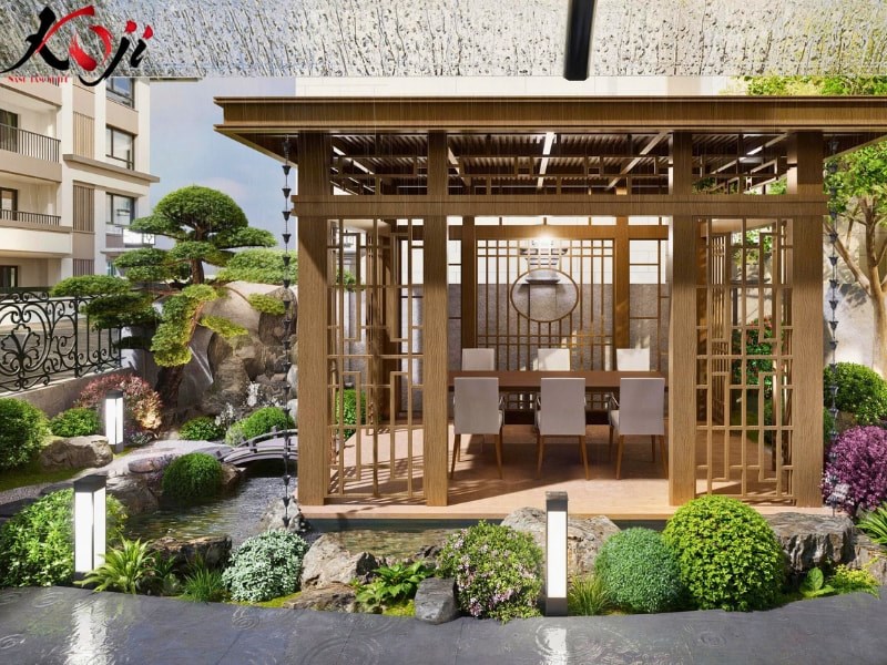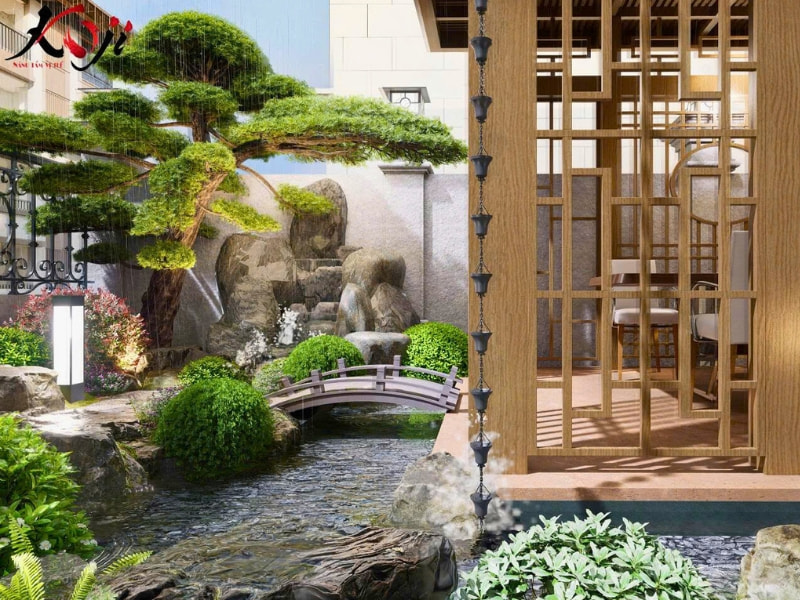 Khu vườn được xây dựng theo phong cách sân vườn Á Đông hiện đại, kết hợp tinh hoa của sân vườn Nhật với sự gần gũi, mềm mại của cảnh quan Việt Nam. Từng chi tiết được bố trí hợp lý: từ lối đi lát đá, chòi nghỉ bằng gỗ, hồ nước, tiểu cảnh cho đến hệ thống cây xanh nhiều tầng lớp. Sự phối hợp nhịp nhàng này mang đến không gian cân bằng, thanh tịnh nhưng vẫn tiện nghi.