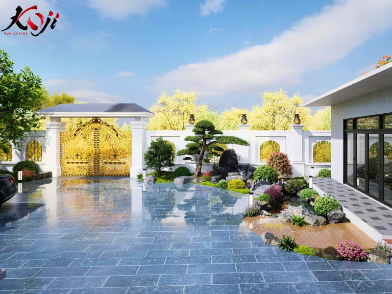 Bước vào khuôn viên, người xem ngay lập tức ấn tượng với cổng biệt thự màu vàng đồng sang trọng, mở ra khoảng sân lát đá tự nhiên phản chiếu ánh trời. Từng chi tiết trong khu vườn được bố trí tinh tế: cụm cây tùng uốn thế bonsai mang dáng vẻ uy nghi, bên cạnh là tiểu cảnh hòn non bộ kết hợp thác nước tạo âm thanh róc rách nhẹ nhàng, giúp cân bằng năng lượng phong thủy cho ngôi nhà.