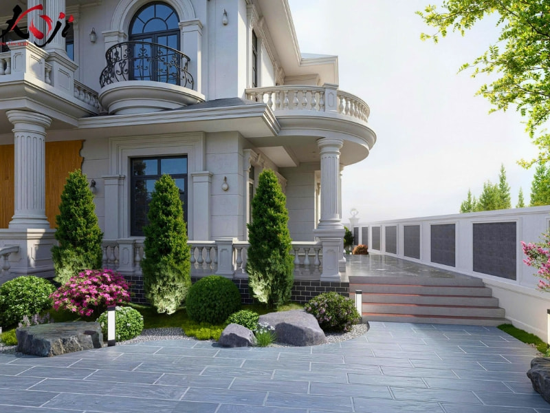 Lối đi quanh nhà được thiết kế bằng đá phiến tự nhiên xen kẽ sỏi trắng, uốn lượn mềm mại dẫn lối qua từng mảng xanh. Hai bên đường là các khóm cây tỉa hình cầu, bụi hoa màu sắc nhã nhặn, tạo nên bố cục hài hòa mà vẫn giữ được nét hiện đại. Ở góc sân, cây ngọc lan, tắc và nguyệt quế được trồng xen kẽ, vừa mang ý nghĩa phong thủy tốt lành, vừa tỏa hương dễ chịu mỗi khi gió thoảng qua.