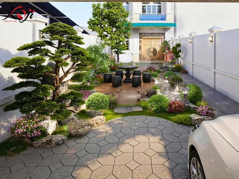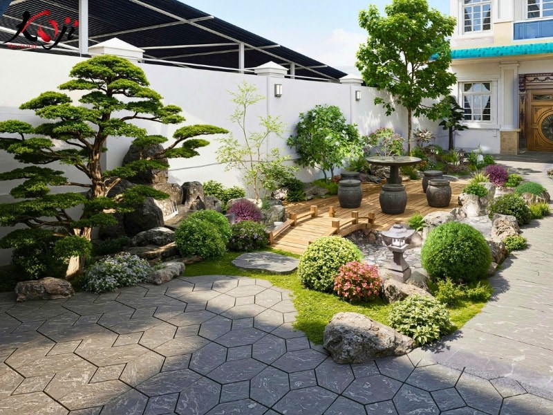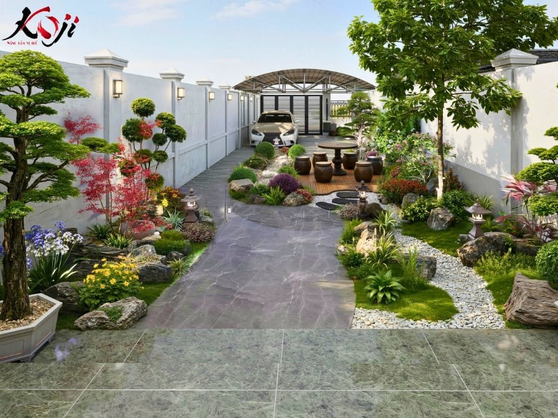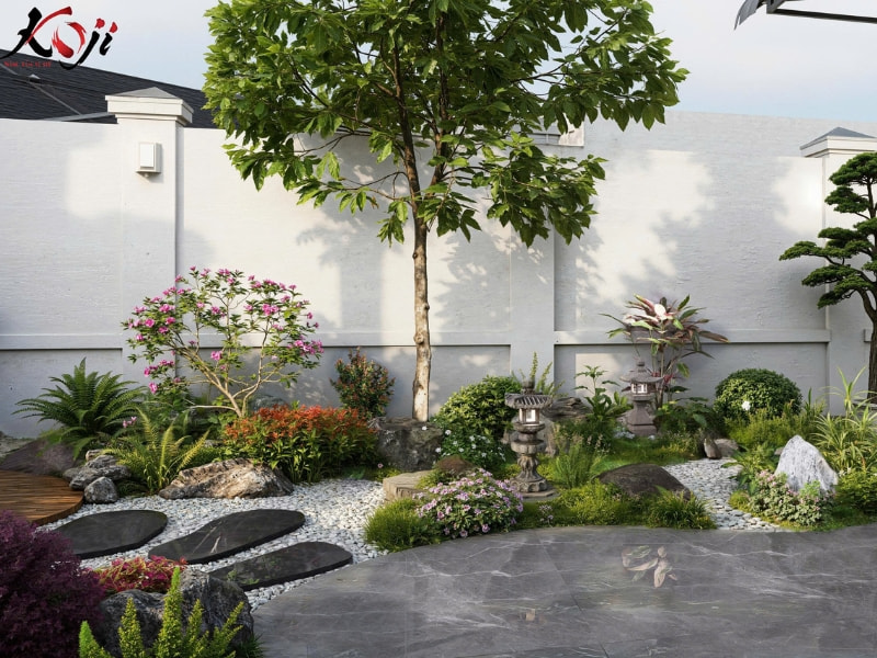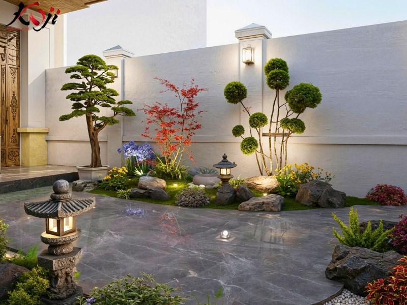 Koji tối ưu từ bản vẽ đến thi công thực tế: chốt cao độ, thoát nước, chọn đá đúng tỉ lệ, phối cây đúng điểm nhìn và hoàn thiện vật liệu ngoài trời bền thời tiết. Nhờ đó, sân vườn giữ được vẻ đẹp ổn định, ít phải sửa chữa về sau.