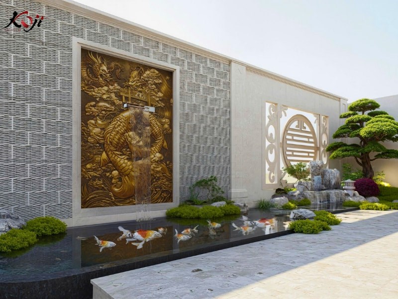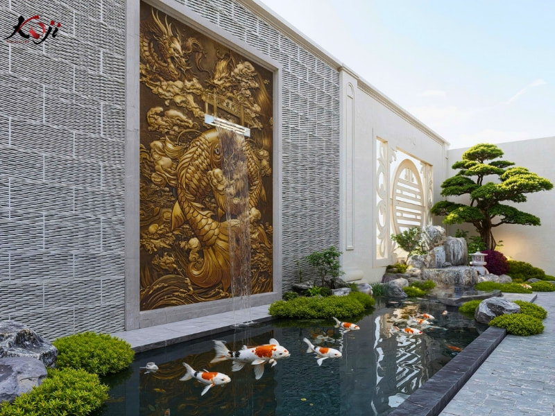 Trung tâm của khu sân vườn là hồ cá Koi thiết kế dáng chữ nhật hiện đại, mặt nước phẳng, chiều sâu được tính toán chuẩn kỹ thuật để đảm bảo môi trường sống ổn định cho cá. Hồ được kết hợp với phù điêu rồng – cá chép hóa rồng gắn tường, tạo dòng thác nước chảy nhẹ nhàng. Không chỉ giúp tăng hàm lượng oxy cho hồ, thác nước còn mang ý nghĩa kích hoạt tài lộc, luân chuyển sinh khí theo phong thủy Á Đông.