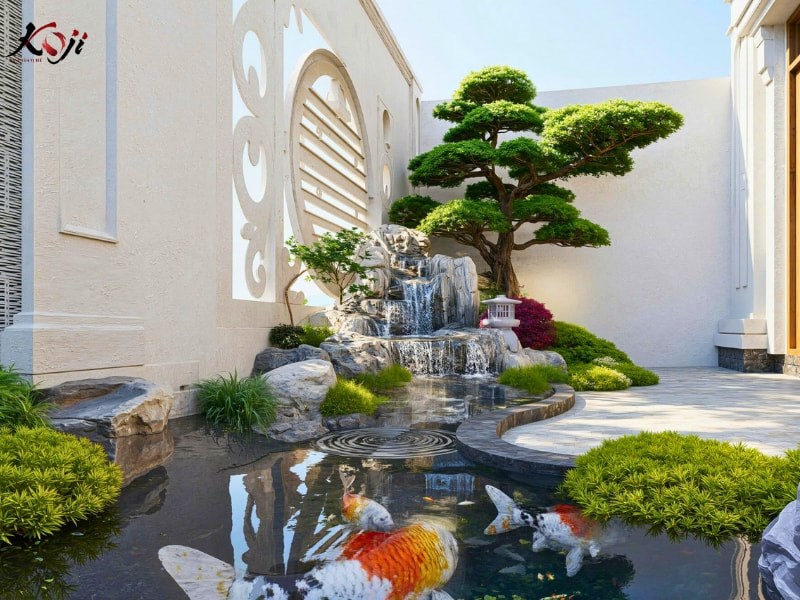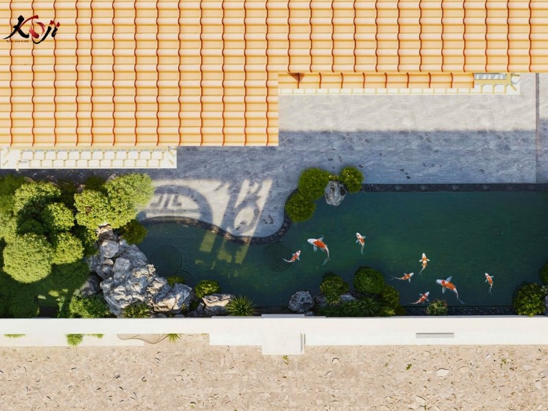Hệ thống lọc hồ Koi được thiết kế âm, đảm bảo nước luôn trong, ít rêu, dễ bảo trì, phù hợp với gia đình bận rộn nhưng vẫn muốn duy trì không gian sân vườn xanh sạch lâu dài.