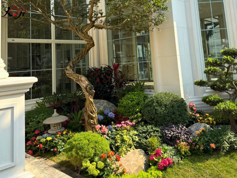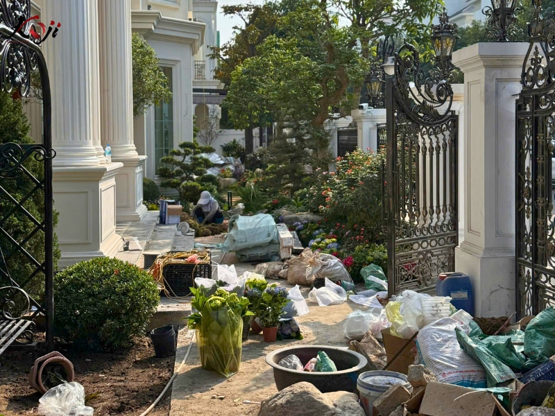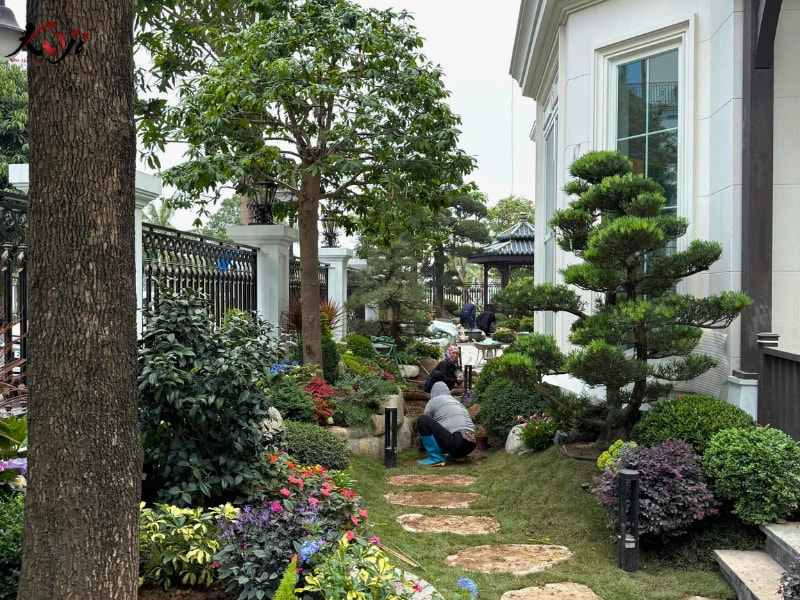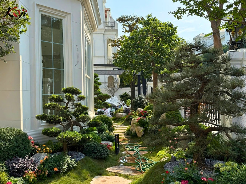 Các khu vực trồng cây lớn, cây dáng thế và tiểu cảnh đã được định vị chính xác, đảm bảo đúng cao độ, khoảng cách và tầm nhìn theo thiết kế, tránh tình trạng rối bố cục hoặc che khuất kiến trúc biệt thự.