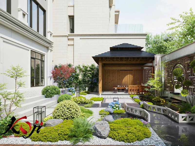 Hồ cảnh nhỏ được bố trí phía trước, uốn cong nhẹ nhàng, tô điểm bằng những cụm cây thủy sinh và khóm hoa thanh khiết. Dòng nước trong trẻo phản chiếu ánh sáng và bóng cây, mang lại cảm giác mát lành, tươi mới quanh năm.