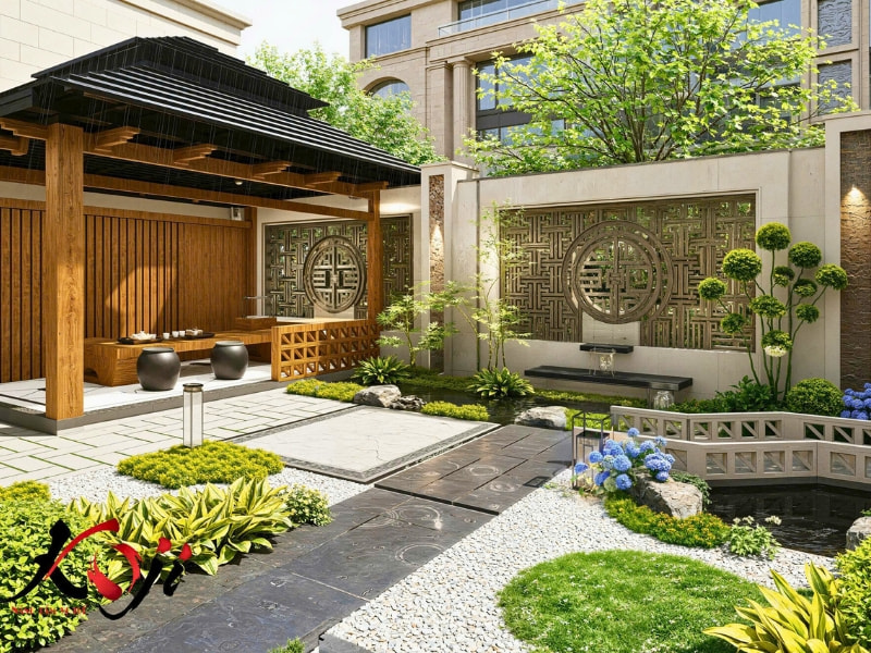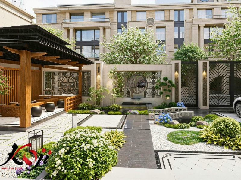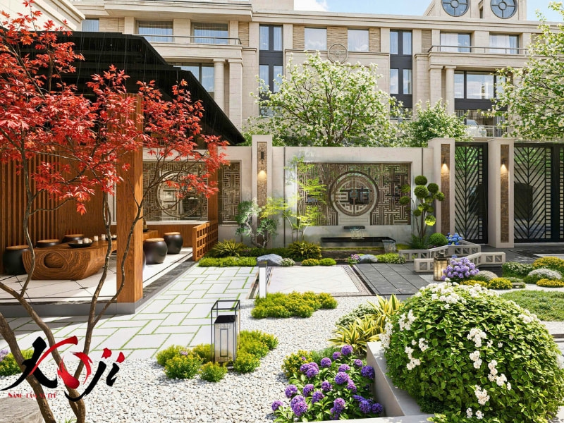 Vật liệu được lựa chọn chủ yếu là gỗ, đá và cây xanh, mang lại cảm giác gần gũi nhưng vẫn sang trọng. Các mảng cỏ, cây bụi và hoa được bố trí theo tầng cao thấp tự nhiên, tạo nên một bố cục mềm mại, uyển chuyển.