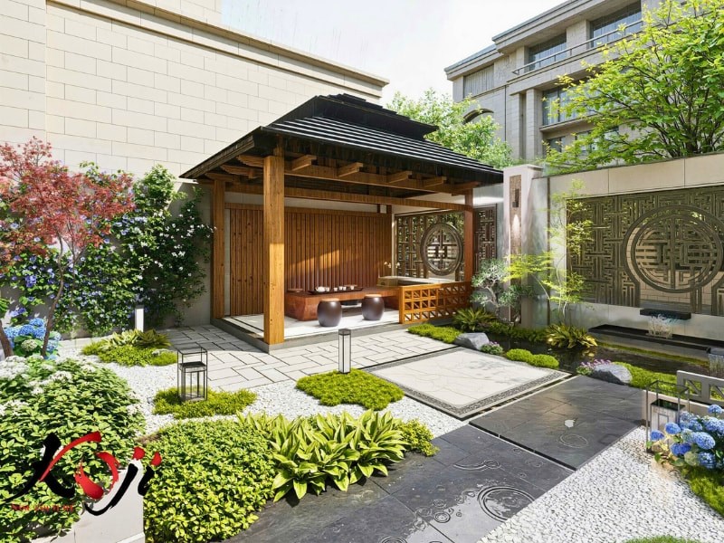 Điểm nhấn nổi bật trong thiết kế là nhà chòi mái đen kiểu Nhật với khung gỗ chắc chắn và bàn trà gọn gàng bên trong. Từ đây, gia chủ có thể ngắm nhìn toàn cảnh khu vườn, thưởng trà hoặc trò chuyện cùng bạn bè trong không gian yên tĩnh.