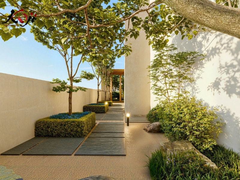 Lối đi được lát bằng đá phiến lớn đan xen trên nền sỏi rải đều, kết hợp hàng cây tán nhỏ tỉa gọn gàng và hệ thống đèn sân vườn ánh vàng dịu, tất cả mang lại sự cân đối tuyệt đối về thẩm mỹ và phong thủy. Mỗi bước chân trên con đường lát đá là một trải nghiệm chậm rãi, như đang thiền giữa khu vườn sống động.