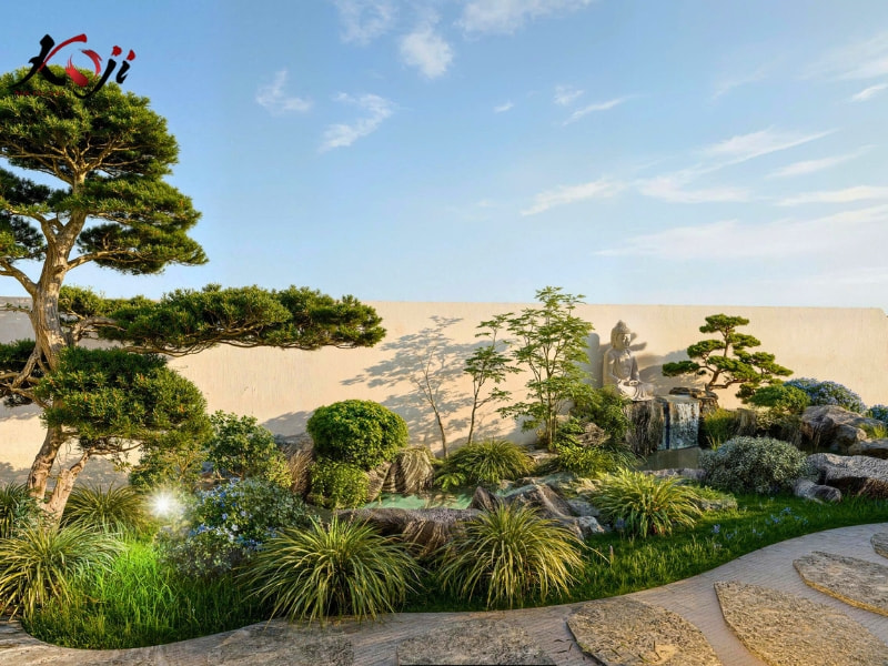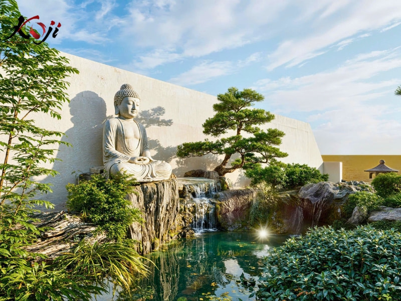 Điểm nhấn đặc biệt của khu vườn là tượng Phật tọa thiền giữa hồ nước xanh trong, phía dưới là thác nước nhỏ chảy róc rách tạo âm thanh tĩnh tại, giúp không gian trở nên nhẹ nhàng và sâu lắng. Bao quanh là những khóm tùng, trúc, cùng thảm cỏ xanh mướt tạo nên cảm giác gần gũi, thanh lọc tâm trí mỗi khi bước vào.