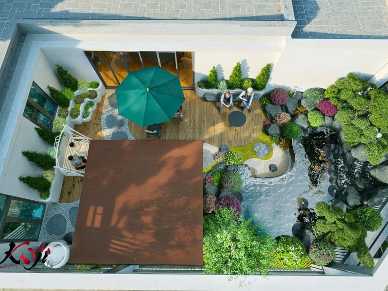 Trung tâm của khu vườn là hồ cá Koi lớn, được thiết kế với đường nét uốn lượn mềm mại, kết hợp hệ thống thác đá và dòng nước chảy nhẹ nhàng, tạo âm thanh tự nhiên giúp cân bằng năng lượng âm – dương. Đàn Koi rực rỡ bơi lội dưới mặt nước trong veo không chỉ mang ý nghĩa phong thủy may mắn mà còn mang lại cảm giác an yên cho gia chủ mỗi khi ngắm nhìn.