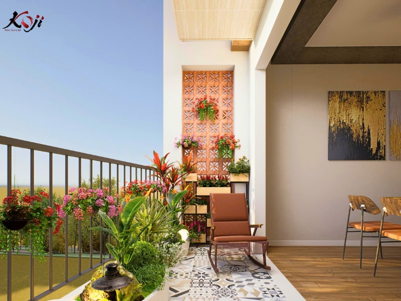 Ghế thư giãn được đặt tại vị trí đón nắng và gió tự nhiên, lý tưởng để đọc sách, uống trà hoặc nghỉ ngơi sau một ngày làm việc. Lan can được kết hợp bồn trồng cây chạy dài, vừa đảm bảo an toàn vừa tạo mảng xanh liên tục, hạn chế cảm giác khô cứng của không gian chung cư.