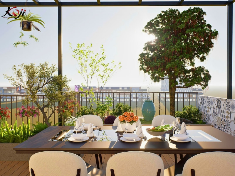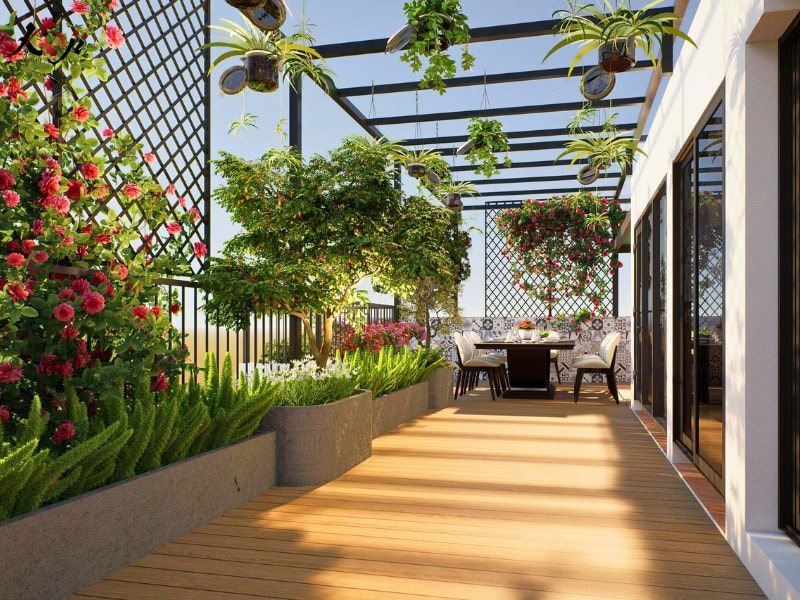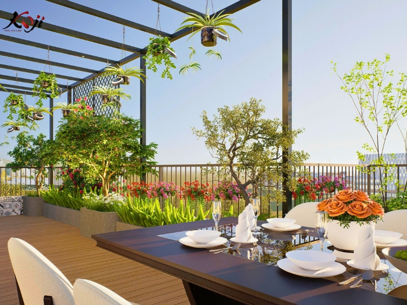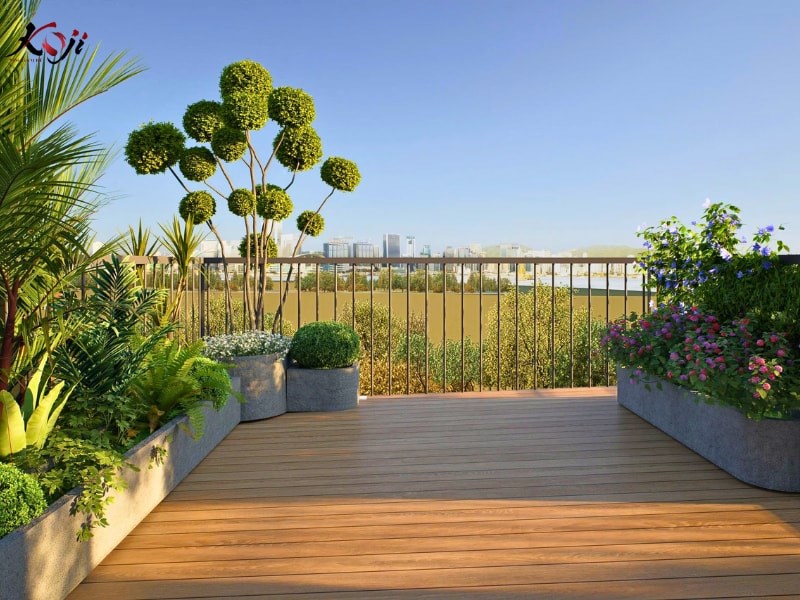 Cây trồng chủ yếu là các loại cây dễ sống, ít rụng lá, phù hợp điều kiện nắng gió trên cao, giúp gia chủ dễ chăm sóc và duy trì vẻ đẹp ổn định theo thời gian.