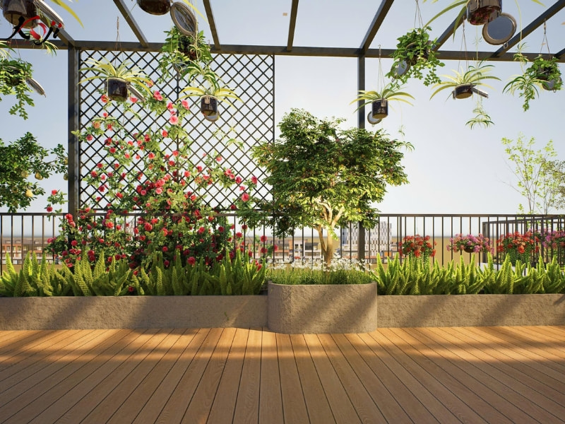 Trong thiết kế sân vườn chung cư, việc lựa chọn vật liệu và cây trồng đóng vai trò rất quan trọng. Các vật liệu như gỗ nhựa ngoài trời, sắt sơn tĩnh điện, chậu nhẹ được ưu tiên để đảm bảo tải trọng và độ bền lâu dài.