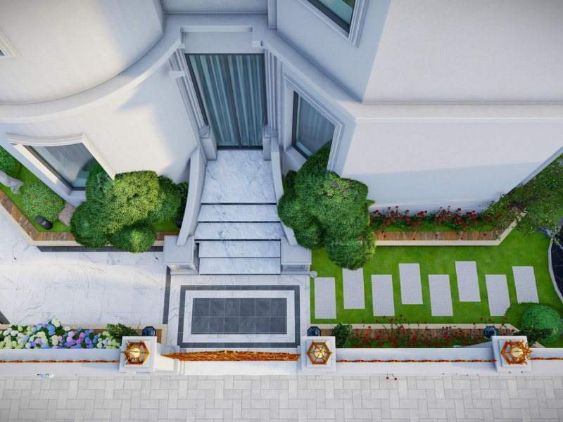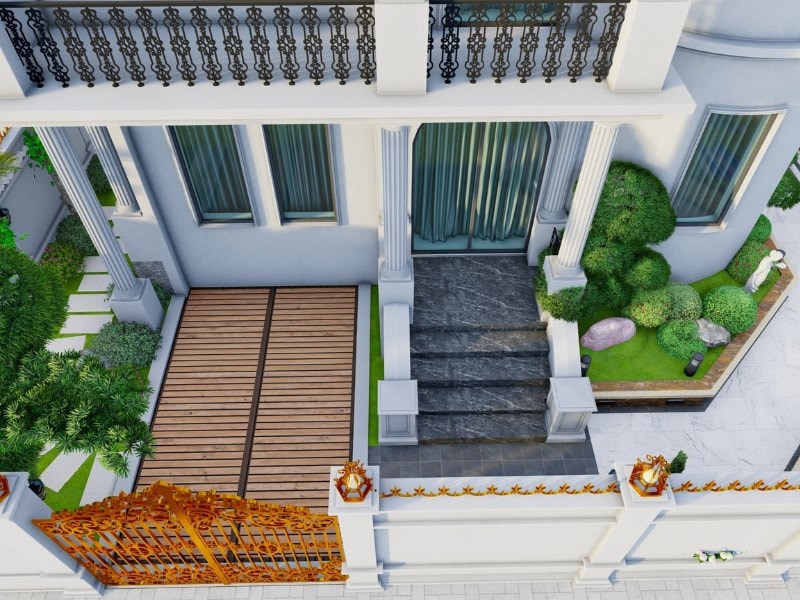 Ngoài ra, các chi tiết như đèn sân vườn, bồn cây, lối đi đều được bố trí hợp lý nhằm tăng tính tiện nghi và đảm bảo ánh sáng vào ban đêm. Việc sử dụng cây xanh theo tầng lớp từ cây cao, cây bụi đến thảm cỏ không chỉ giúp không gian luôn tươi mát mà còn tạo cảm giác riêng tư cho toàn bộ khuôn viên biệt thự.