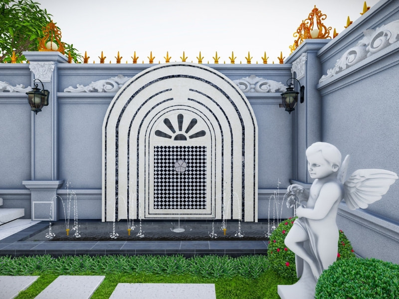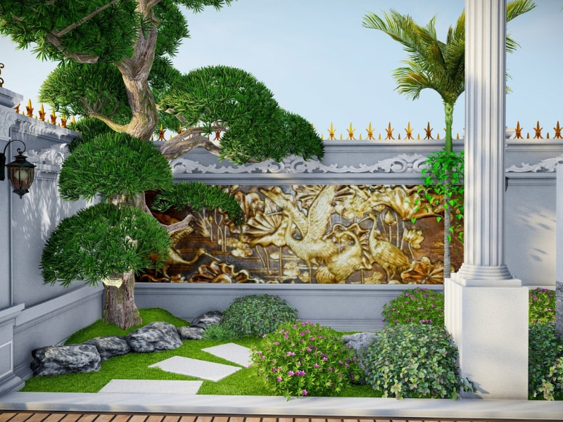 Một điểm đặc biệt khác của dự án là mảng tường trang trí phù điêu nghệ thuật, mang đậm dấu ấn cổ điển, giúp tăng thêm chiều sâu văn hóa và giá trị thẩm mỹ cho không gian sân vườn. Đây chính là yếu tố tạo nên sự khác biệt so với các thiết kế thông thường.