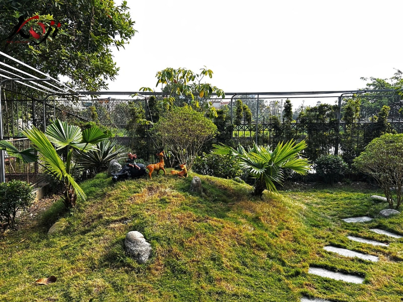 Sau khi hoàn thiện, tổng thể khu vườn hiện lên nhẹ nhàng và tự nhiên. Lối dạo bằng đá được bố trí mềm mại, dẫn lối qua những thảm cỏ xanh, những cụm cây được cắt tỉa vừa đủ để giữ nét tự nhiên nhưng vẫn gọn gàng. Không gian không quá dày cây, cũng không trống trải, mà được tính toán để mỗi góc nhìn đều có điểm dừng, có chiều sâu.