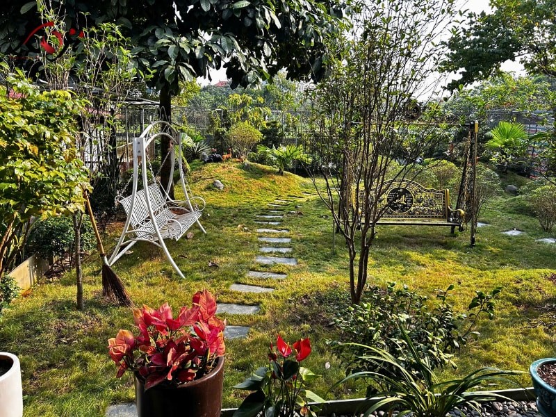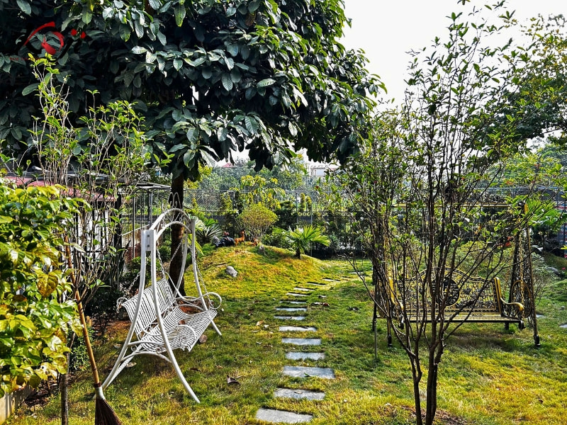 Những chiếc xích đu đặt nép mình dưới tán cây lớn trở thành điểm nhấn quen thuộc của khu vườn. Ở đó, chỉ cần ngồi xuống, đung đưa nhẹ theo gió, là đã có thể cảm nhận rõ sự yên tĩnh mà không gian này mang lại. Cây xanh được chọn lựa theo hướng dễ chăm sóc, phù hợp khí hậu, kết hợp hài hòa giữa tầng cao – tầng trung – tầng thấp, giúp khu vườn luôn có sức sống quanh năm.