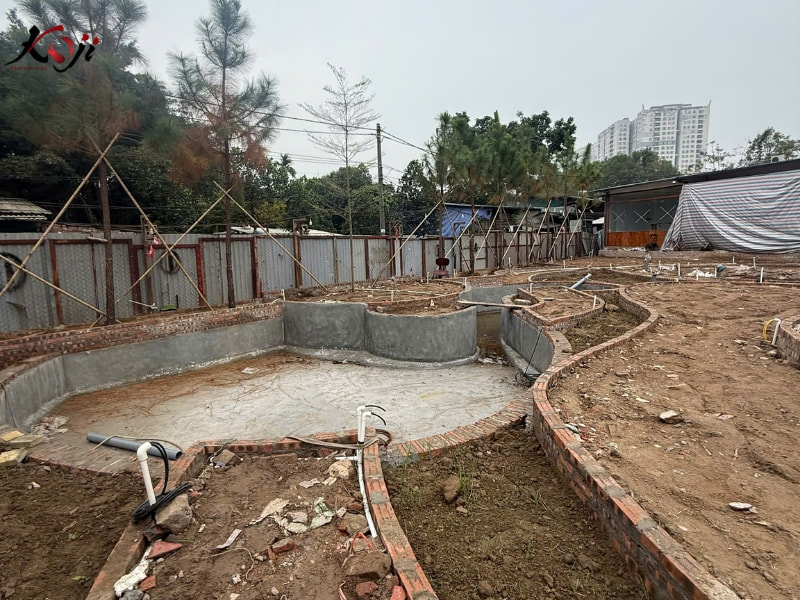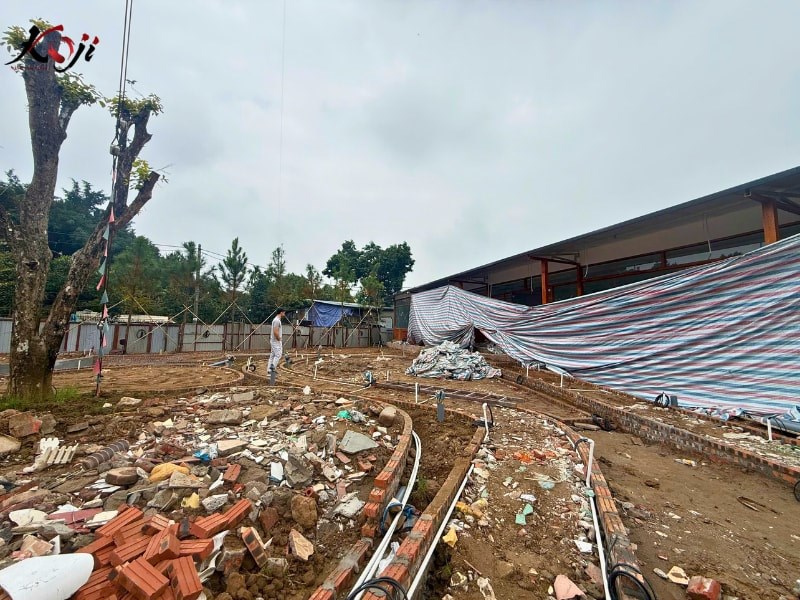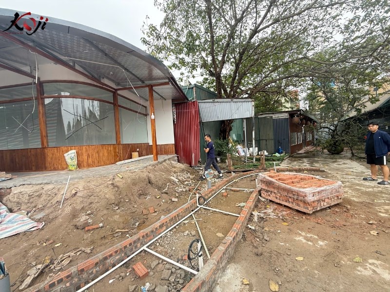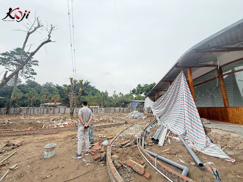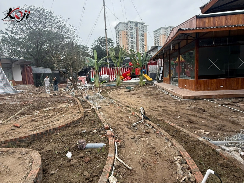 Dự án thi công quán cafe sân vườn quy mô lớn lần này được Koji Landscape triển khai với mục tiêu tạo nên một không gian trải nghiệm trọn vẹn, nơi khách hàng không chỉ đến để thưởng thức đồ uống mà còn để tận hưởng bầu không khí xanh mát và thư giãn đúng nghĩa. Ngay từ giai đoạn thi công, toàn bộ mặt bằng đã được xử lý nền, phân cao độ và tổ chức lại hệ thống thoát nước nhằm đảm bảo vận hành ổn định lâu dài, đặc biệt với mô hình sân vườn có nhiều cây xanh và mặt nước.