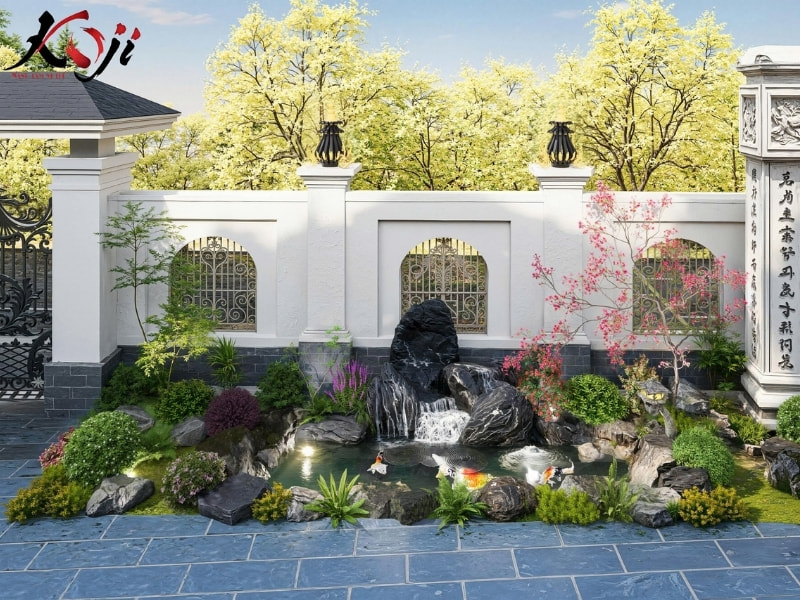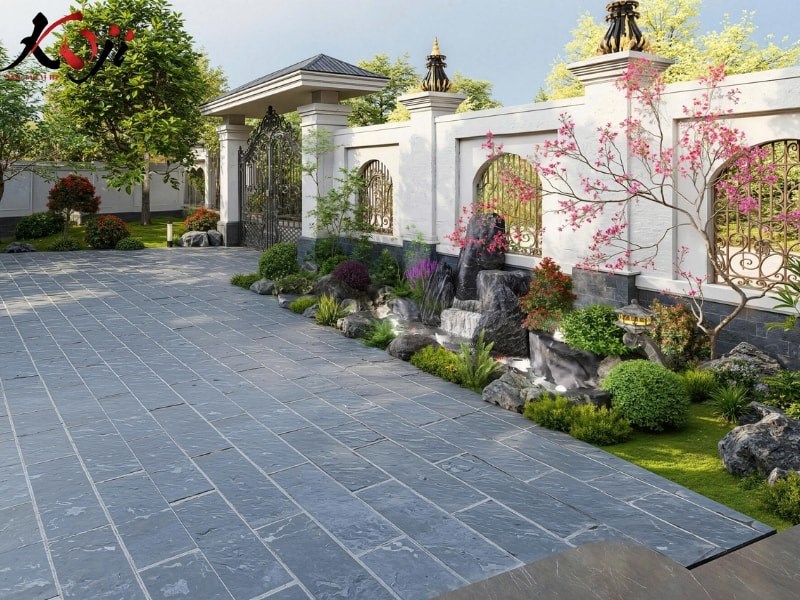 Dọc theo tường rào là dải tiểu cảnh xanh được thiết kế như một “viền mềm” để cân bằng lại mảng sân lớn. Koji sử dụng cụm đá tự nhiên tạo điểm nhấn, kết hợp cây dáng thanh và các lớp cây bụi thấp, hoa điểm màu, giúp khu vườn có chiều sâu mà vẫn giữ sự nền nã, không rối mắt. Bố cục tiểu cảnh chạy dài tạo cảm giác liền mạch, dẫn mắt từ cổng vào đến khu nhà chính, đồng thời giúp không gian nhìn xanh hơn ngay cả khi đứng ở khoảng sân rộng.