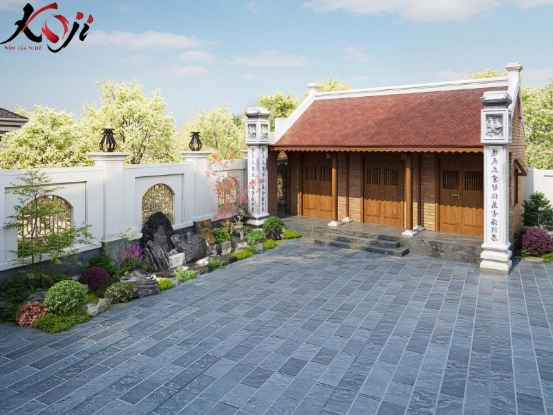 Dự án nhà vườn được Koji Landscape triển khai theo hướng gọn, thoáng, bền, ưu tiên sự chỉn chu ngay từ khu sân trước để tôn kiến trúc truyền thống của ngôi nhà. Tổng thể không gian được tổ chức với một khoảng sân lát đá rộng làm trục chính, tạo sự sạch sẽ, dễ sử dụng và thuận tiện cho sinh hoạt gia đình, lễ tết hay tiếp khách.