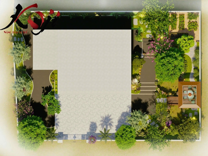 Không gian 345m² được khai thác tối đa cả về thẩm mỹ, công năng lẫn phong thủy. Hồ Koi đóng vai trò thu hút vượng khí, giúp dòng năng lượng trong khu vườn luôn luân chuyển. Cây xanh và mặt nước giúp điều hòa không khí, mang lại cảm giác mát mẻ quanh năm. Những mảng xanh được bố trí hợp lý còn giúp che nắng, tạo bóng đổ đẹp mắt và mang đến sự riêng tư cho gia chủ.