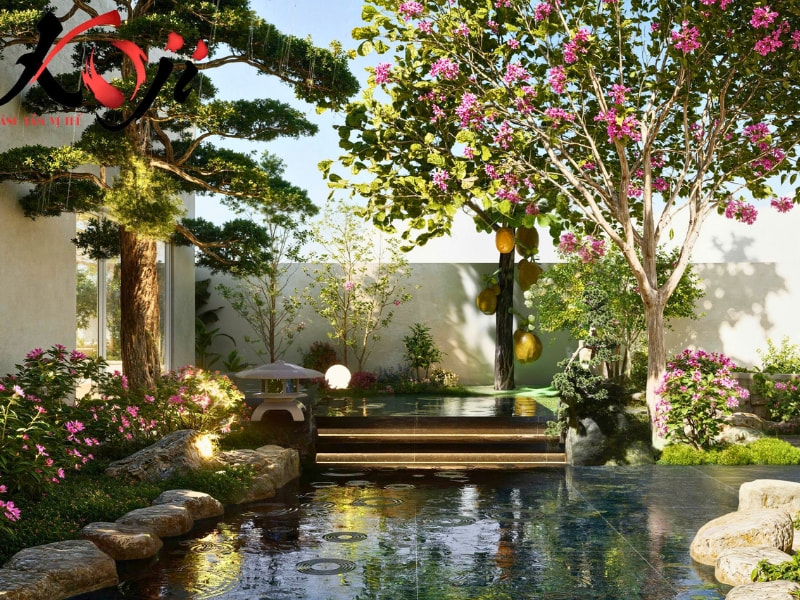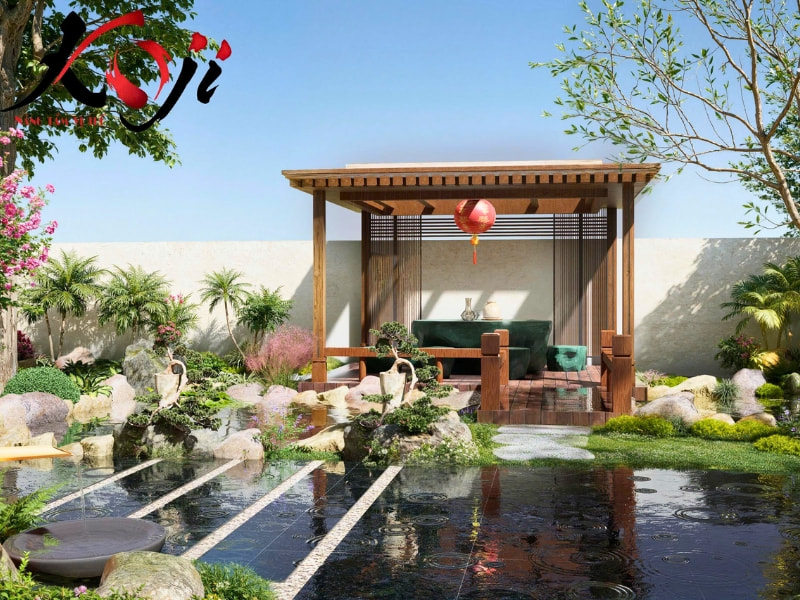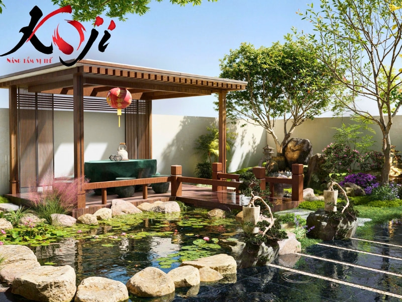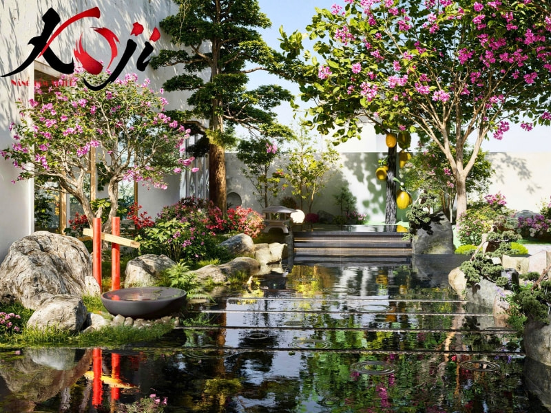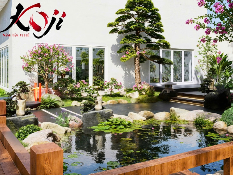 Lấy cảm hứng từ phong cách Zen Nhật, toàn bộ khu vườn được bố trí theo hướng tối giản nhưng tinh tế, tập trung vào sự cân bằng giữa nước, đá, cây, ánh sáng nhằm tạo nên một không gian thư giãn chuẩn nghỉ dưỡng. Điểm nhấn đầu tiên và ấn tượng nhất của dự án chính là hồ cá Koi rộng lớn nằm ở trung tâm khu vườn.