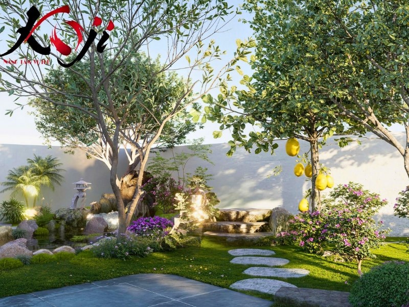 Sự kết hợp này tạo ra chiều sâu thị giác, đồng thời giúp khu vườn luôn thay đổi màu sắc theo mùa. Một số vị trí được bố trí tiểu cảnh đá, suối chảy và đèn sân vườn kiểu Nhật, mang đến cảm giác yên tĩnh và giàu tính thiền định, đặc biệt là vào buổi tối khi ánh sáng được bật lên, tạo ra những khoảng sáng tối rất nghệ thuật.