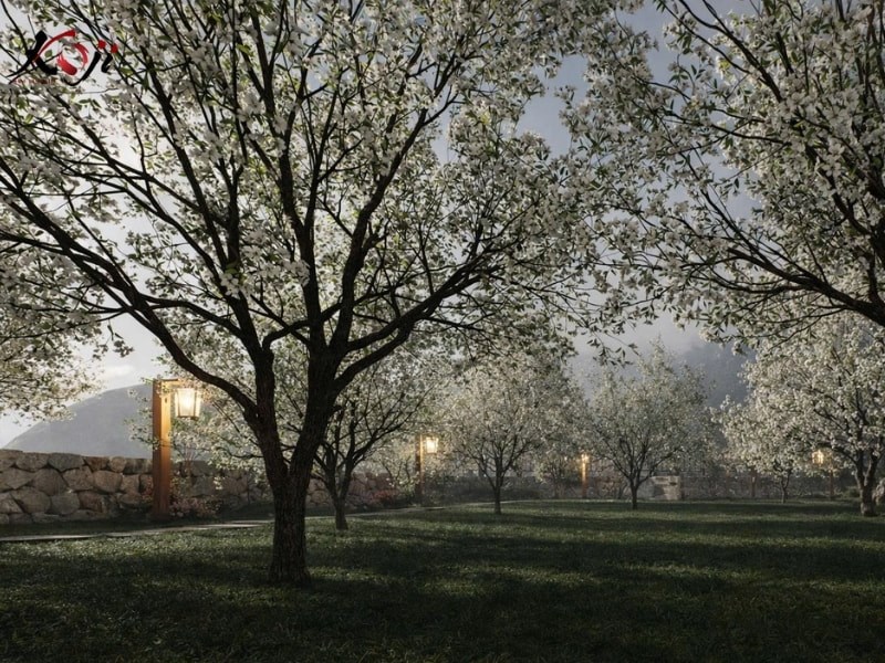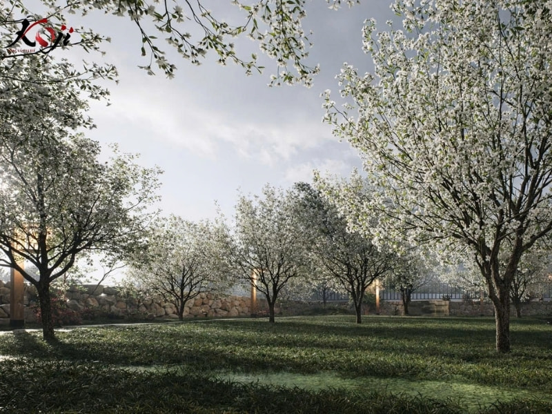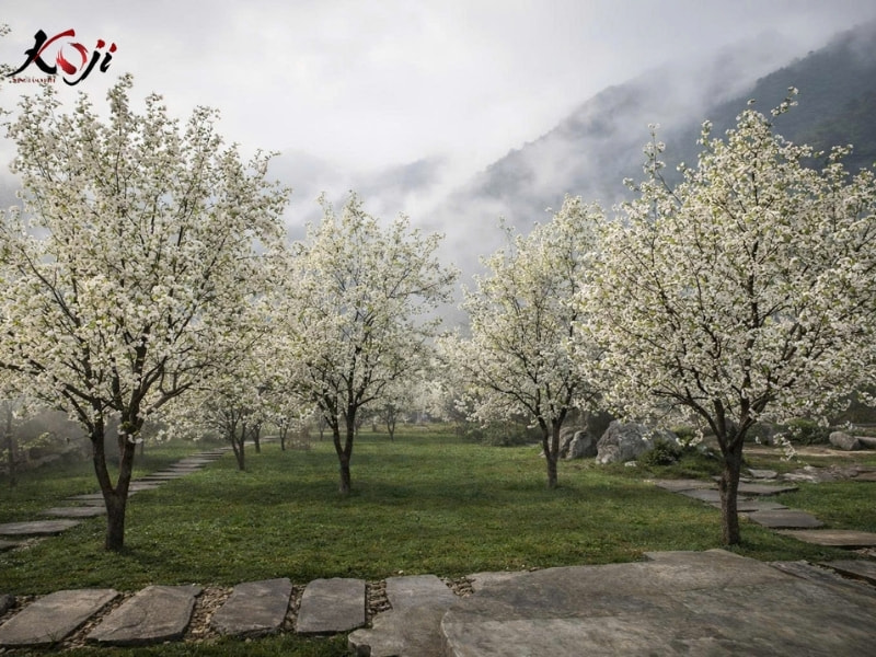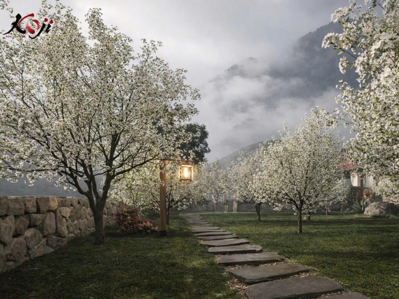 Khi bước sâu hơn vào dự án homestay vùng núi cao này, Koji dành riêng một khoảng không gian để tạo nên “khu vườn mơ”, một nơi chỉ cần đứng yên cũng thấy lòng nhẹ lại. Giữa nền cỏ xanh mướt là những hàng cây nở trắng đồng loạt, tán xòe mềm trong sương, tạo cảm giác như đang đi lạc vào một mùa hoa kéo dài mãi.