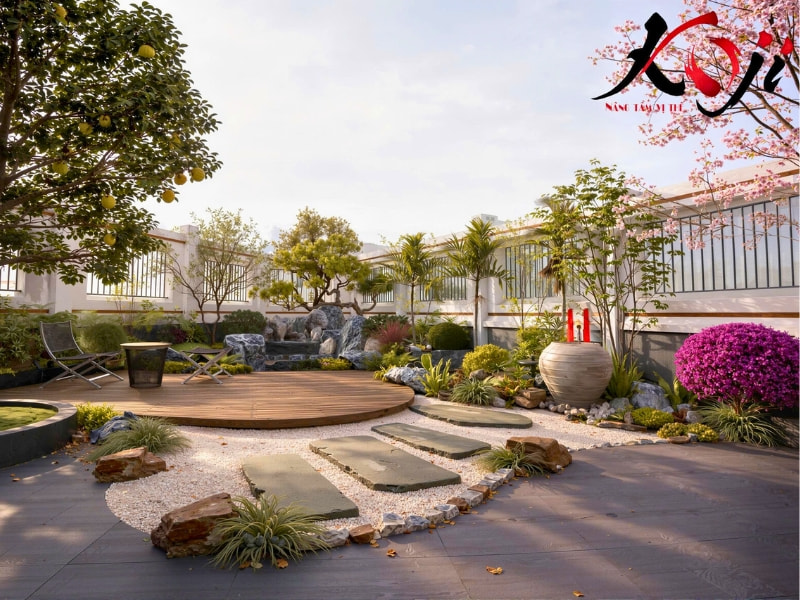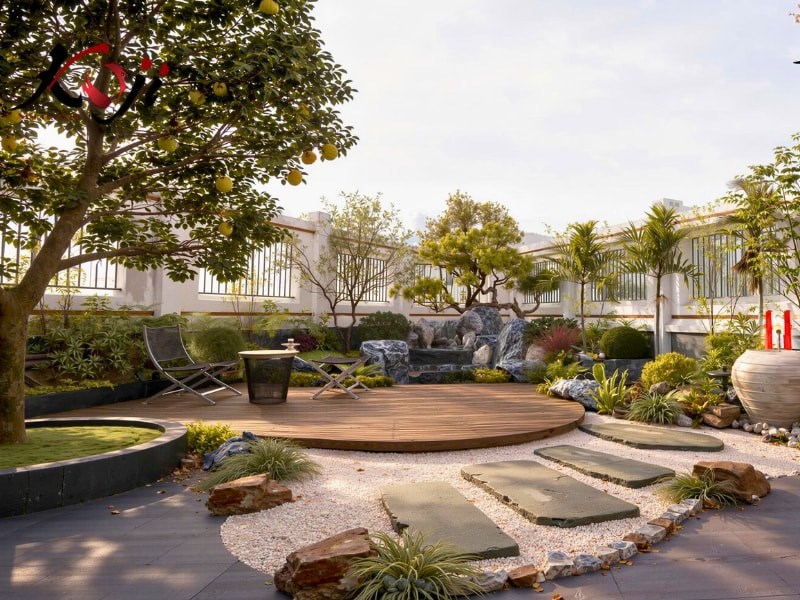 Hệ cây trồng được lựa chọn kỹ lưỡng, kết hợp giữa cây tán nhỏ, cây bụi và thảm nền nhằm tạo nên nhiều lớp không gian mà không gây cảm giác chật chội. Các chi tiết như đá bước dạo, tiểu cảnh khô hay chậu trang trí được bố trí có chủ ý, giúp khu vườn trở nên sinh động nhưng vẫn giữ được sự gọn gàng, tinh tế.