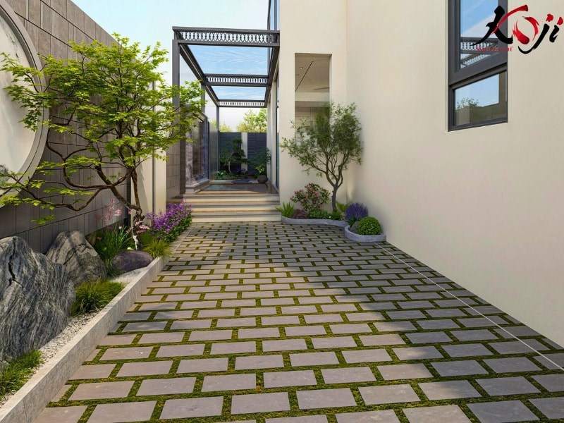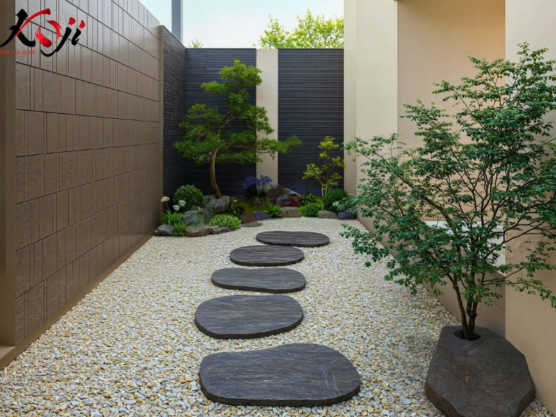Một chi tiết không thể thiếu trong sân vườn Nhật là lối đi stepping stone trên nền sỏi trắng. Những phiến đá tròn được sắp xếp có chủ ý, dẫn dắt từng bước chân, tạo nên trải nghiệm dạo vườn nhẹ nhàng và thiền định. Kết hợp cùng cây xanh bố trí hai bên, không gian trở nên sâu hơn và có chiều hướng rõ ràng.