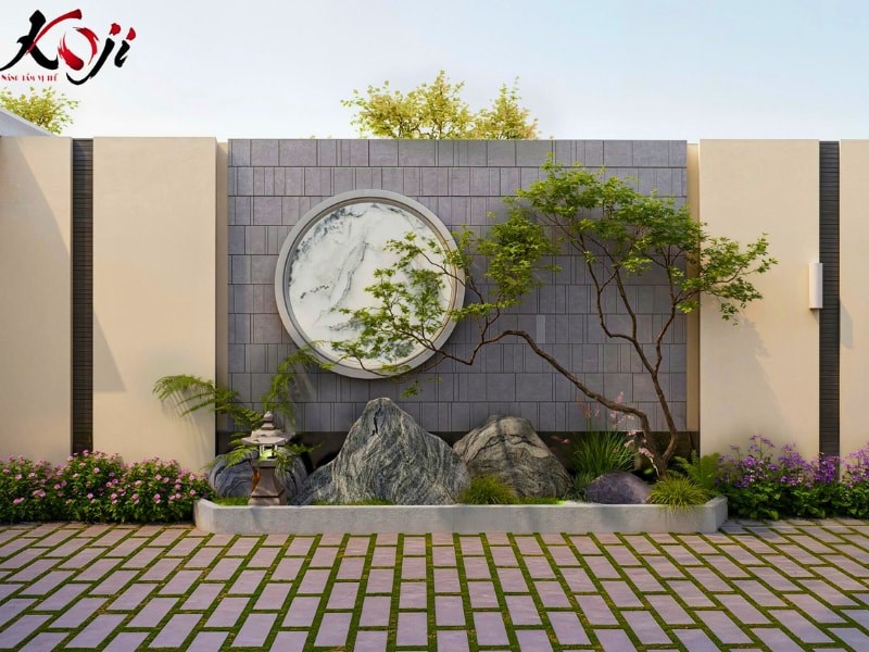 Điểm nhấn nổi bật của thiết kế là khu vực tiểu cảnh tường với vòng tròn nghệ thuật, là biểu tượng của sự viên mãn và cân bằng trong văn hóa Nhật Bản. Kết hợp cùng đá tự nhiên và cây bonsai dáng mềm mại, không gian trở nên sinh động nhưng vẫn giữ được sự tĩnh lặng đặc trưng của phong cách Zen.