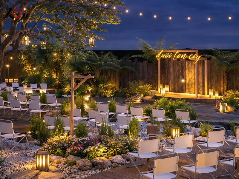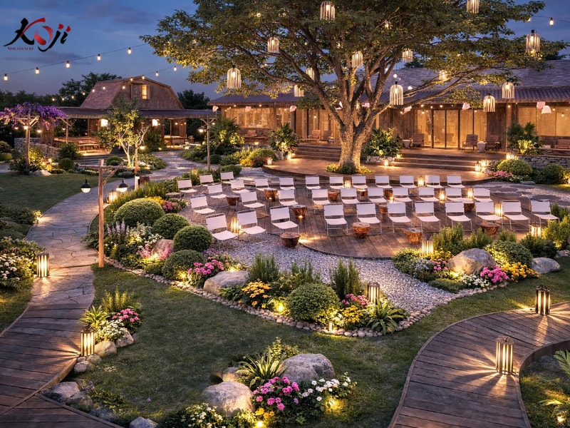 Cây xanh trong thiết kế được bố trí theo lớp, với một cây bóng mát lớn đóng vai trò trung tâm thị giác và tạo mái che tự nhiên cho khu sự kiện. Hệ đèn treo trang trí kết hợp đèn sân vườn bố trí thấp mang lại hiệu ứng ánh sáng ấm áp khi về đêm, biến toàn bộ không gian thành một khu vườn lung linh và giàu cảm xúc. Bản 3D giúp chủ đầu tư hình dung rõ kịch bản hoạt động ban ngày – buổi tối, từ đó có cơ sở điều chỉnh phương án trước khi bước vào thi công.