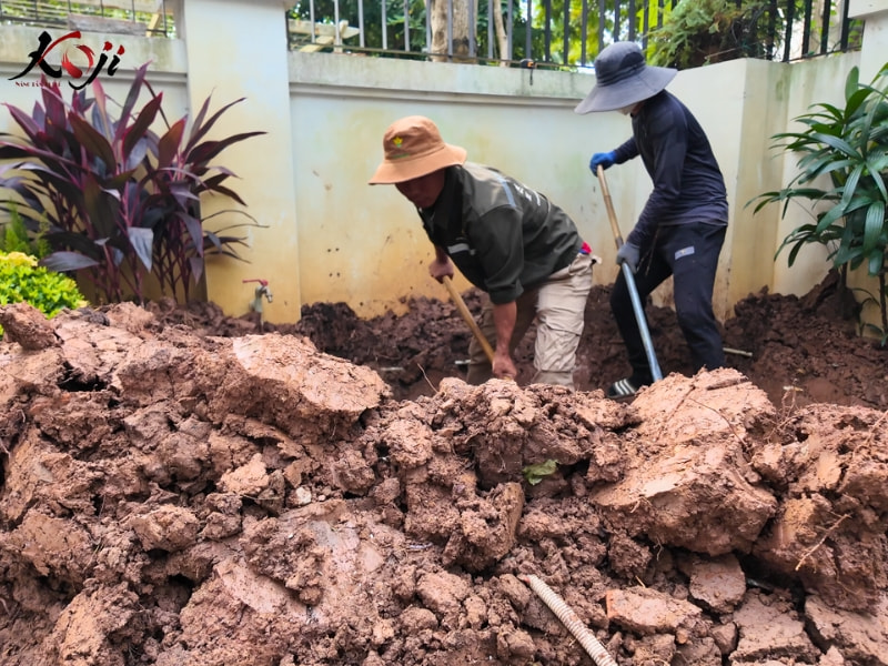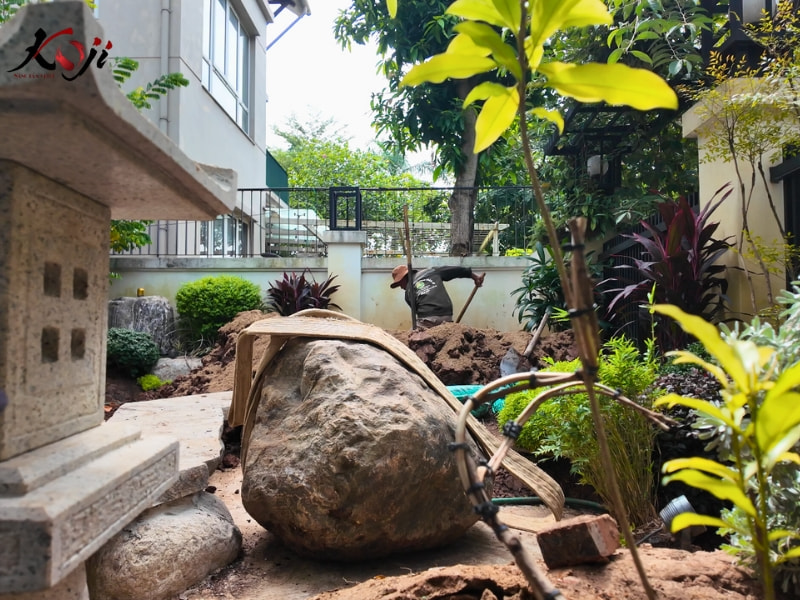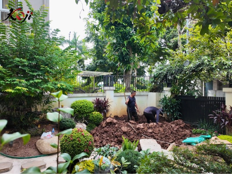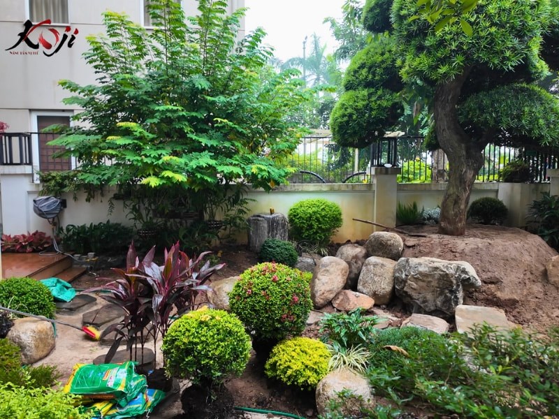 Hiện tại, dự án đang trong giai đoạn thi công trồng cây và hoàn thiện chi tiết cảnh quan. Các mảng đá lớn đã được cố định, nền đất đang được xử lý kỹ để đảm bảo độ thoát nước và sự phát triển lâu dài của cây trồng. Đội ngũ Koji Landscape luôn chú trọng từng chi tiết, từ cách chọn loại đá, độ cao cây, cho đến hướng ánh sáng và hướng gió, tất cả nhằm đạt được sự cân bằng tinh tế đúng tinh thần “Wabi-Sabi” của Nhật.