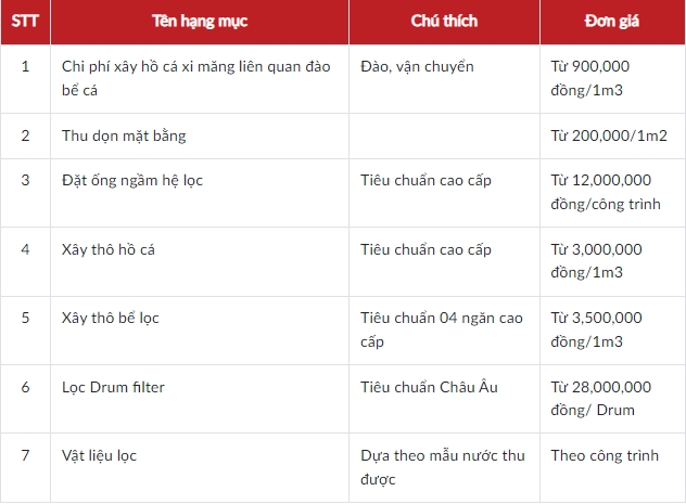 Dưới đây là bảng giá tham khảo một số hạng mục cơ bản về thiết kế hồ cá Koi của Koji Landscape. Ngoài ra, những hạng mục khác sẽ có các mức giá khác nhau.