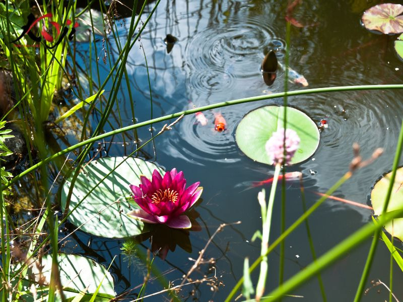 Bao quanh hồ cá koi tự nhiên không cần quá trau chuốt với các bụi cây mọc tự nhiên và cỏ dại.